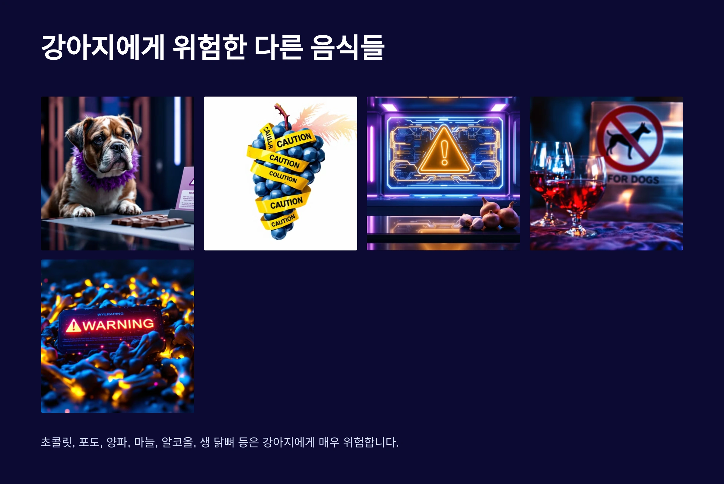 포도는 강아지의 신장에 치명적인 영향을 줄 수 있고, 초콜릿은 심장과 신경계에 부정적인 영향을 미쳐요. 양파와 마늘은 적혈구를 파괴해 빈혈을 일으킬 수 있답니다.