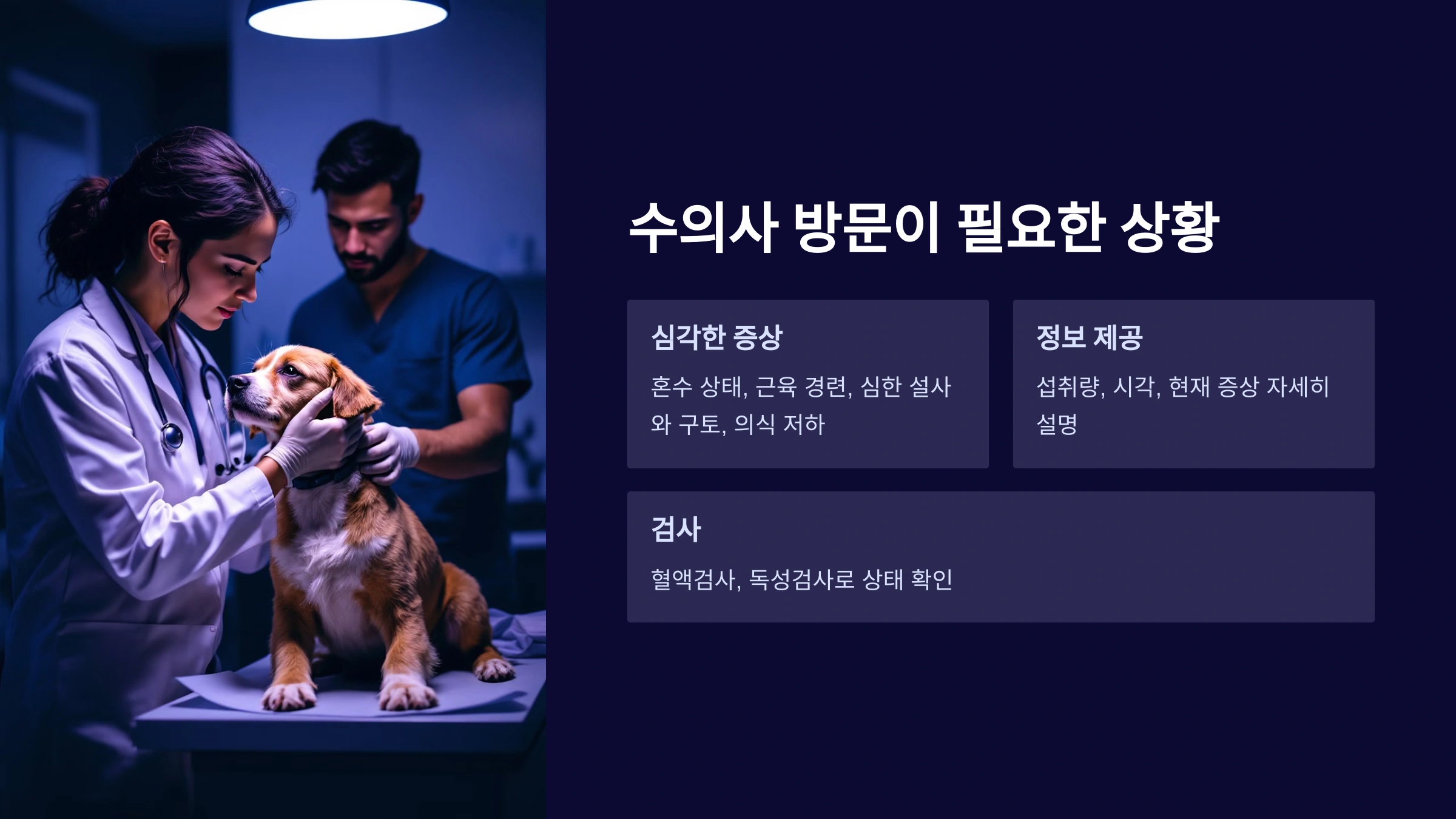 강아지가 감자 싹을 먹은 후 심각한 증상이 나타난다면 즉시 수의사를 찾아야 해요. 혼수 상태, 근육 경련, 심한 설사와 구토, 의식 저하 등의 증상은 빠른 전문적인 치료가 필요하답니다.