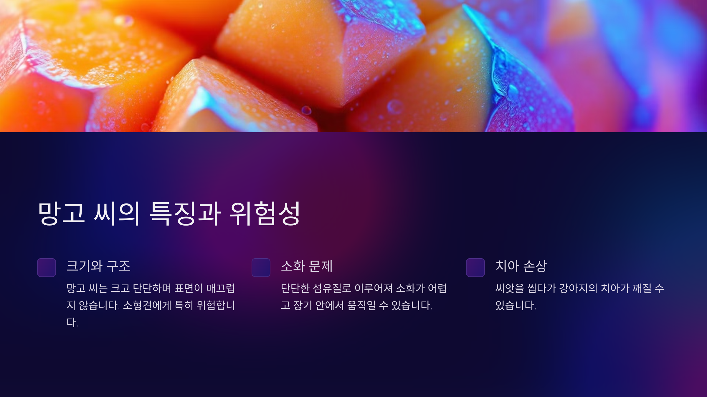망고 씨는 단순히 물리적인 크기 문제만 있는 게 아니에요. 씨앗의 외부는 딱딱한 섬유질로 이루어져 있어 강아지가 씹어 삼킬 경우 소화가 되지 않고 장기 안에서 움직일 수 있어요. 특히 이물질로 인해 소화관 폐쇄나 장내 문제가 발생할 가능성이 크답니다.