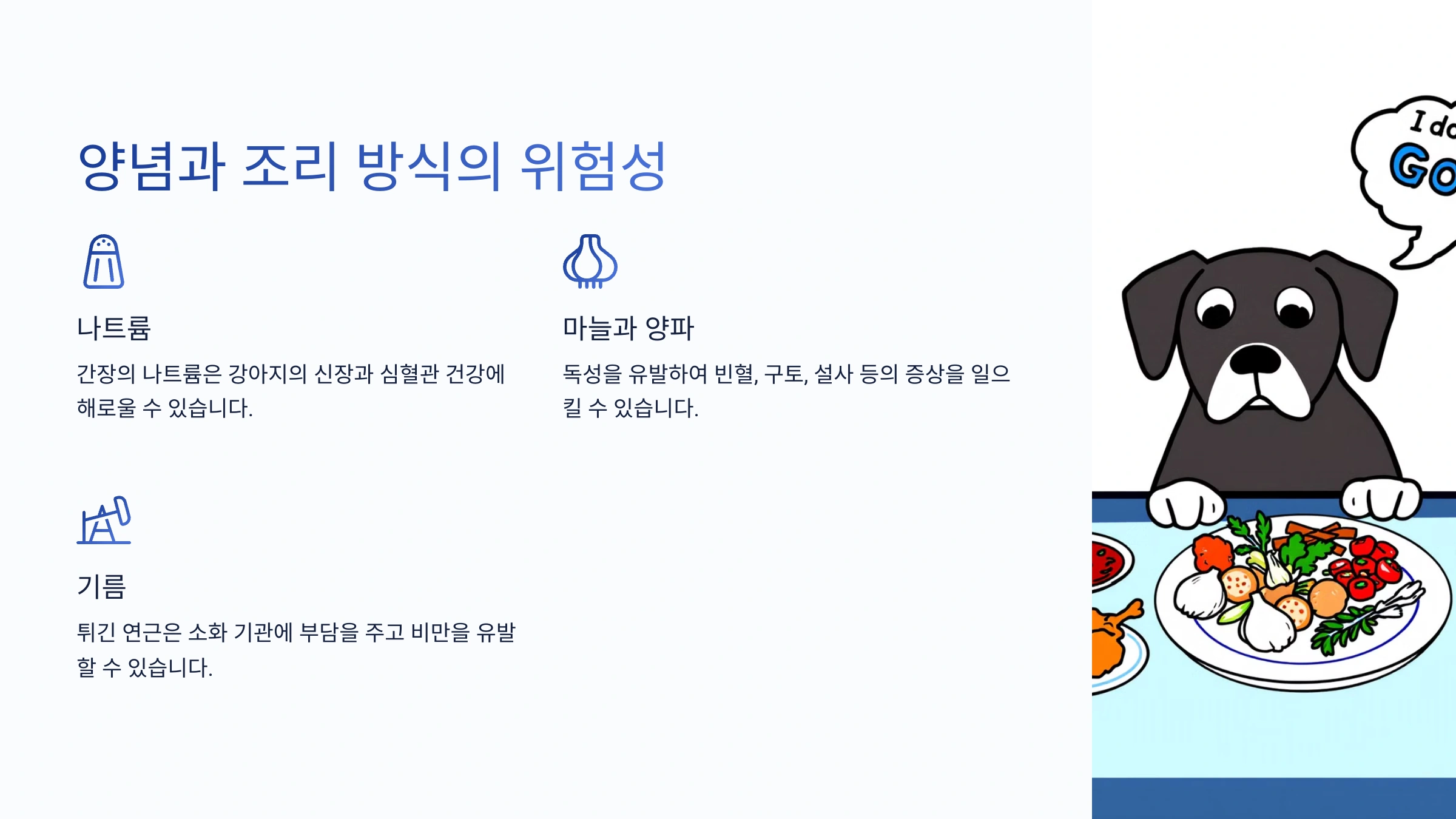 예를 들어, 간장에 들어 있는 나트륨은 강아지의 신장과 심혈관 건강에 해로울 수 있어요. 마늘과 양파는 강아지에게 독성을 유발할 수 있으며, 적은 양이라도 섭취하면 빈혈, 구토, 설사 등의 증상이 나타날 수 있어요.