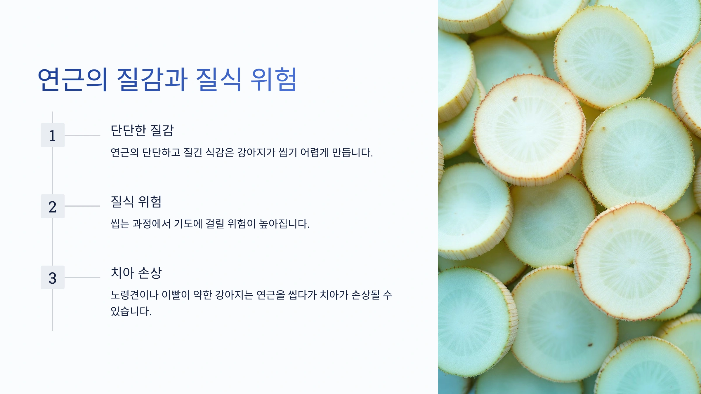연근은 단단하고 질긴 식감을 가지고 있어요. 이는 강아지가 씹기 어렵게 만들고, 삼키는 과정에서 기도에 걸릴 위험을 높여요. 특히 작은 강아지나 씹는 습관이 약한 강아지에게 연근을 주면 질식할 가능성이 있어요.