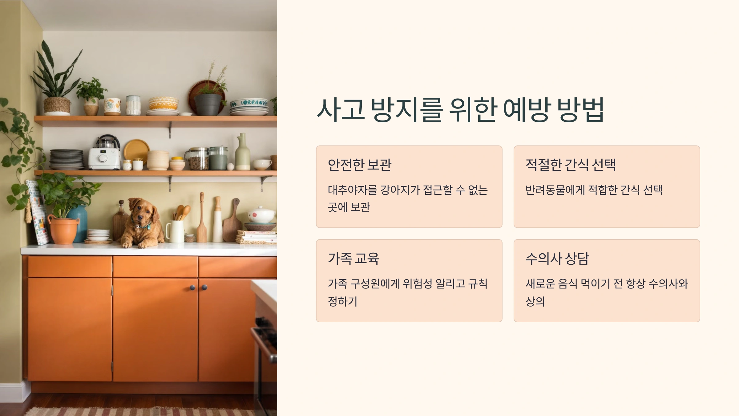 대추야자를 강아지가 접근할 수 없는 곳에 보관하는 것이 가장 확실한 예방법이에요. 밀폐된 용기에 보관하거나, 강아지가 뛰어오를 수 없는 높은 곳에 두는 것이 좋아요.