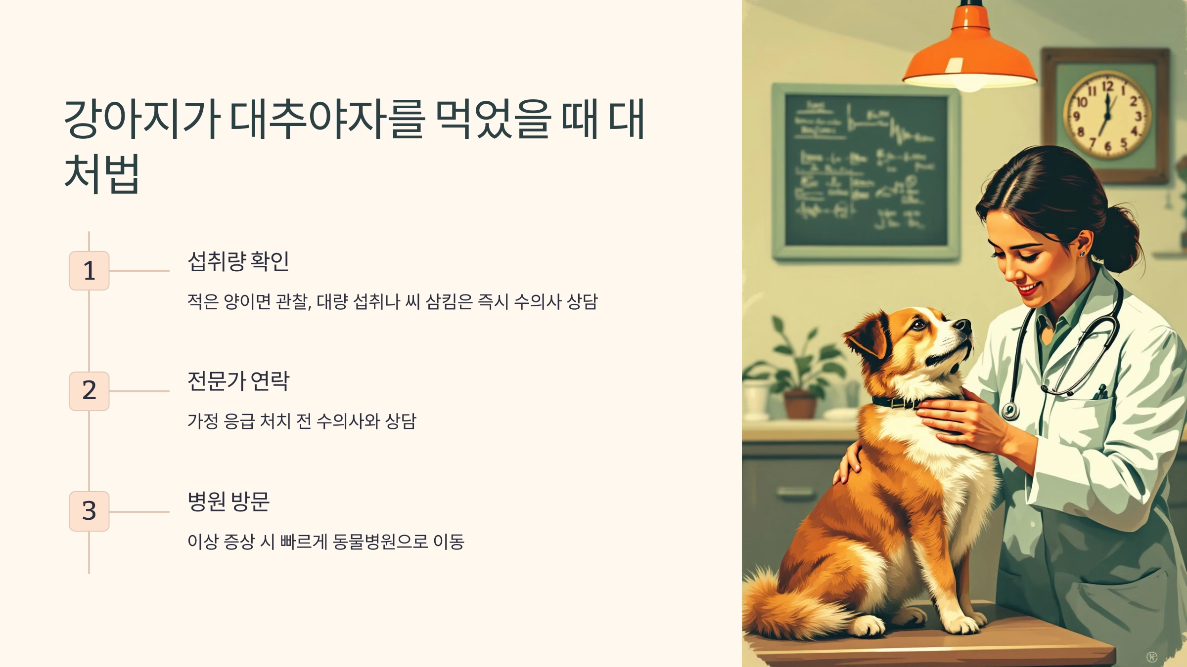 만약 강아지가 구토, 설사, 무기력 등 이상 증상을 보인다면 가까운 동물병원으로 빠르게 이동하는 것이 최우선이에요. 특히 대추야자 씨로 인해 장폐색이 의심될 경우 수술이 필요할 수 있으니 지체하지 말아야 해요.