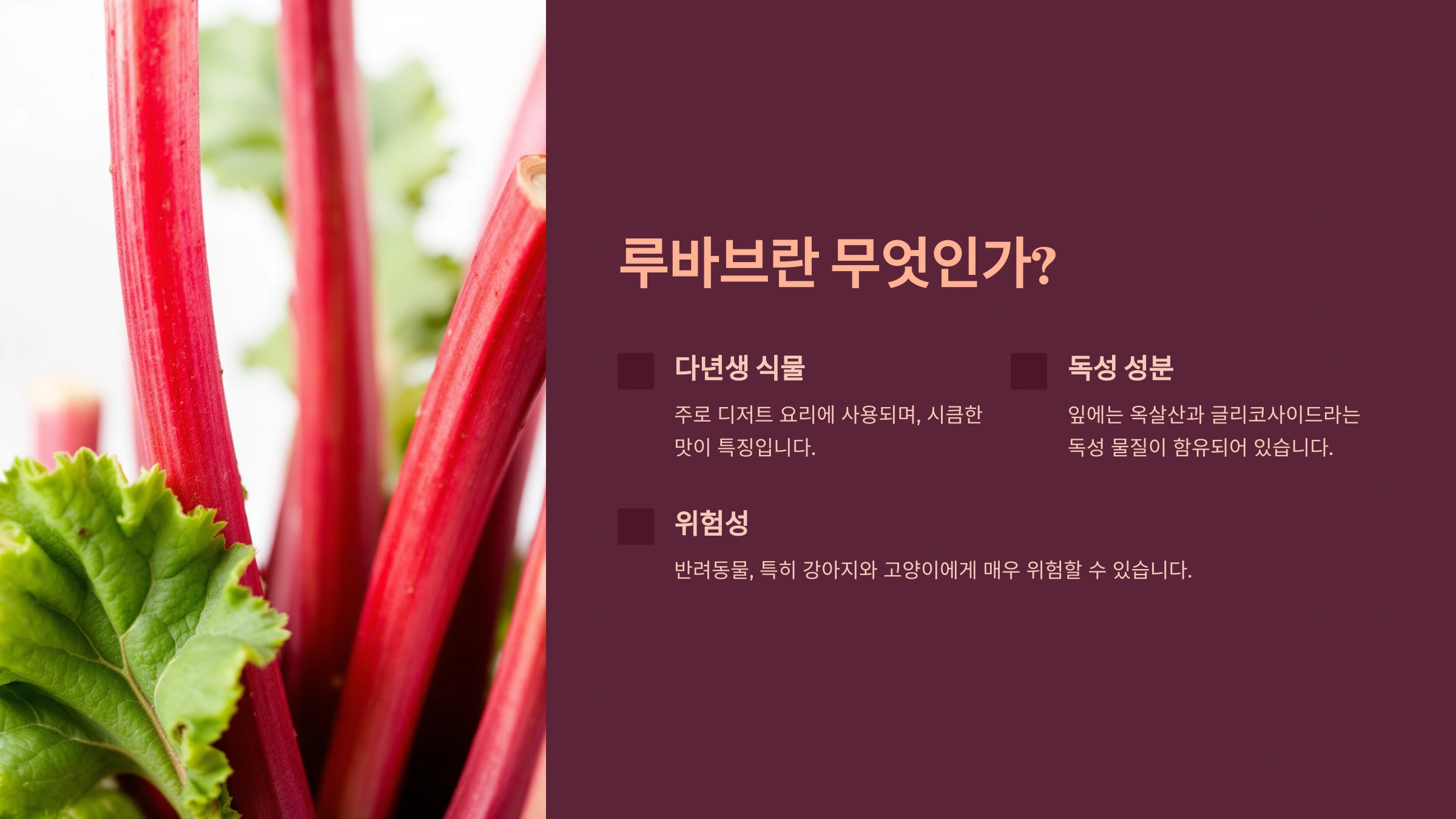 루바브는 주로 디저트 요리에 사용되는 다년생 식물이에요. 시큼한 맛이 특징이며, 잎이 아닌 줄기를 먹는 것이 일반적이에요. 하지만 루바브의 잎에는 옥살산과 글리코사이드라는 독성 물질이 함유되어 있어요. 이러한 성분은 인간에게도 해롭지만 특히 강아지나 고양이 같은 반려동물에게 더 위험할 수 있어요.