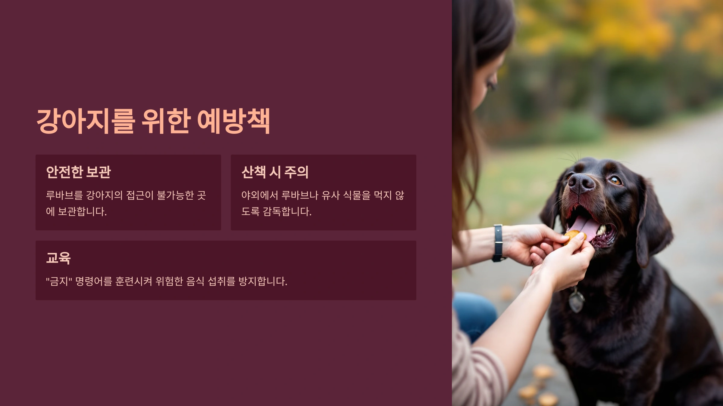 A4. 루바브를 강아지가 접근할 수 없는 곳에 보관하고, 산책 시 식물을 먹지 못하도록 교육하세요.