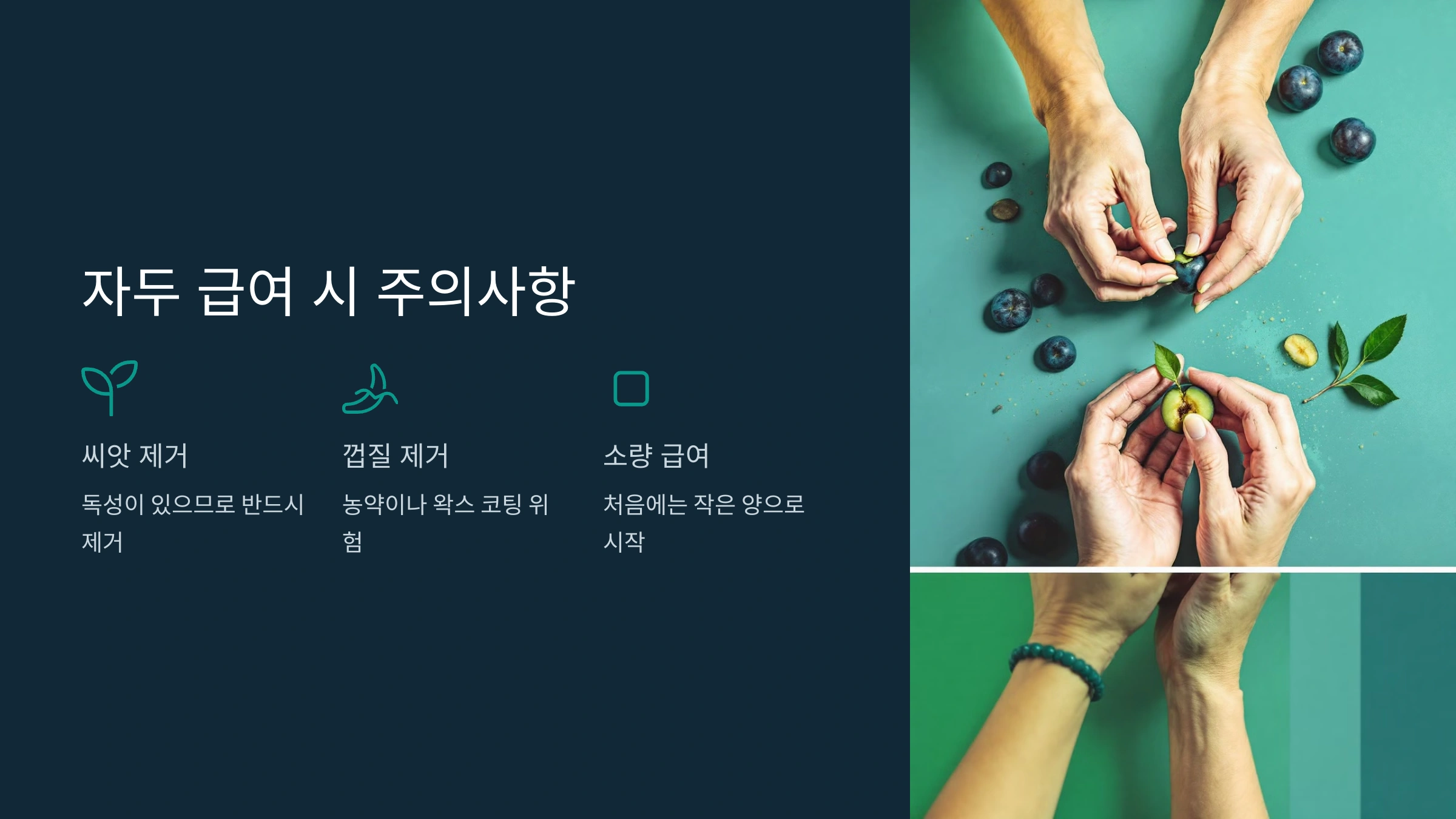 | 씨앗 제거 | 자두 씨앗은 독성이 있으므로 반드시 제거해야 해요. |