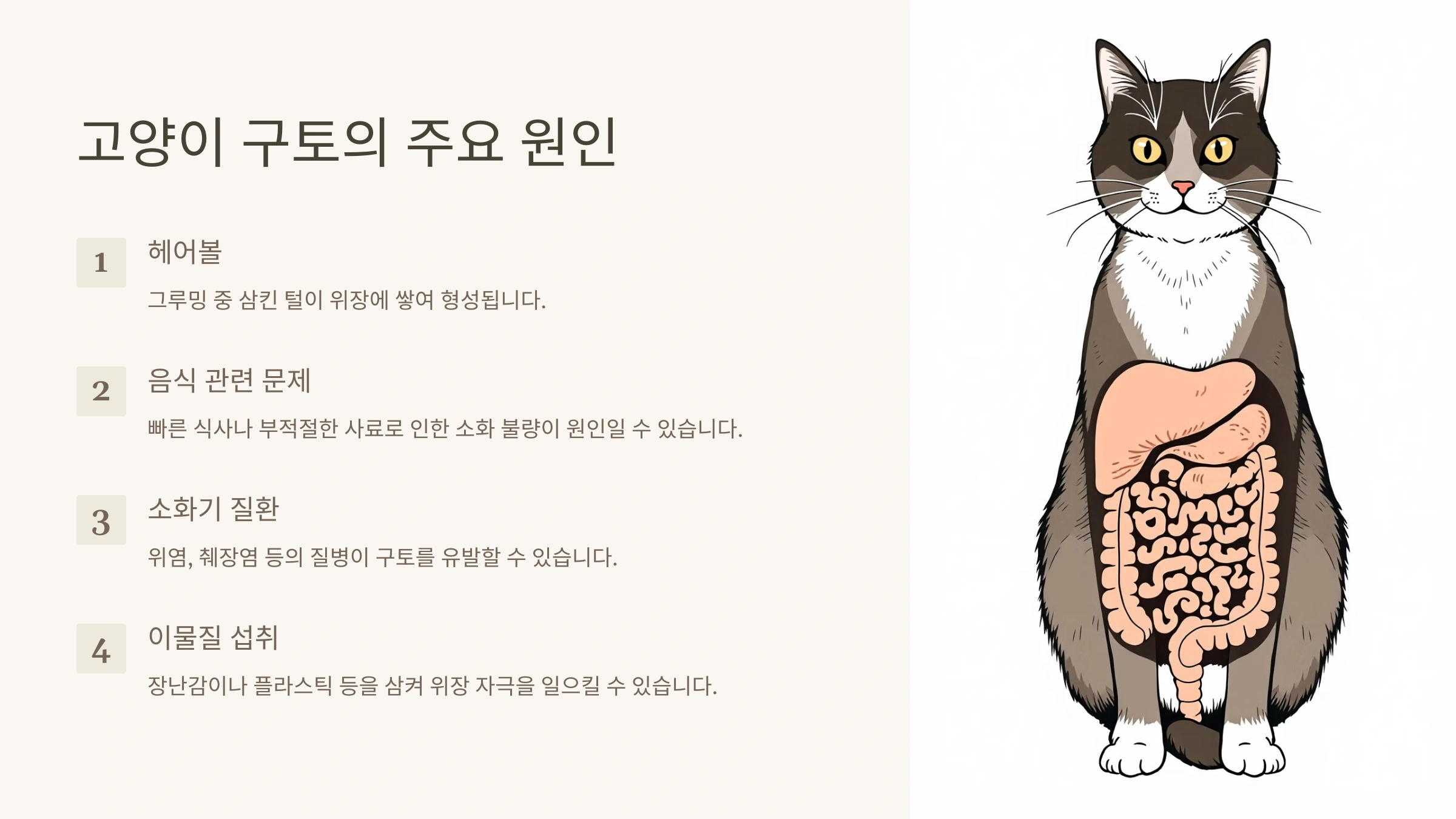 고양이는 스스로 그루밍을 하면서 털을 많이 삼켜요. 이 털이 위에서 소화되지 않고 뭉치면 헤어볼이 형성되고, 이를 배출하려다 구토를 하게 돼요.