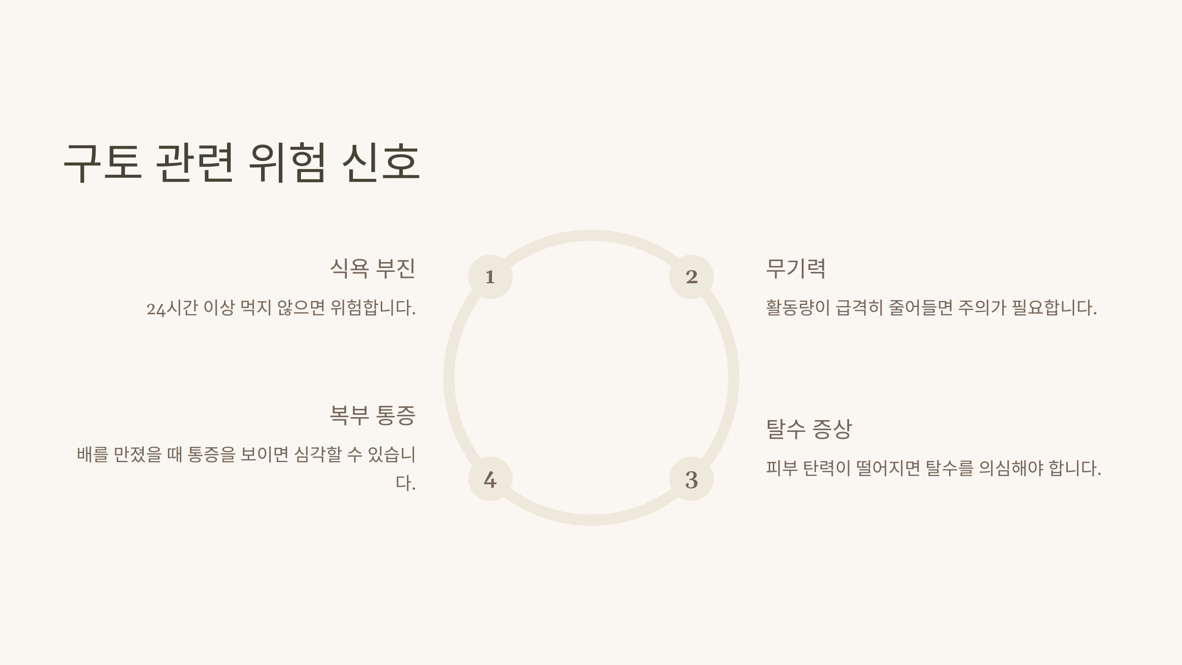 | 위염 | 공복 구토, 식욕 감소 | 소량씩 자주 급여, 병원 방문 |