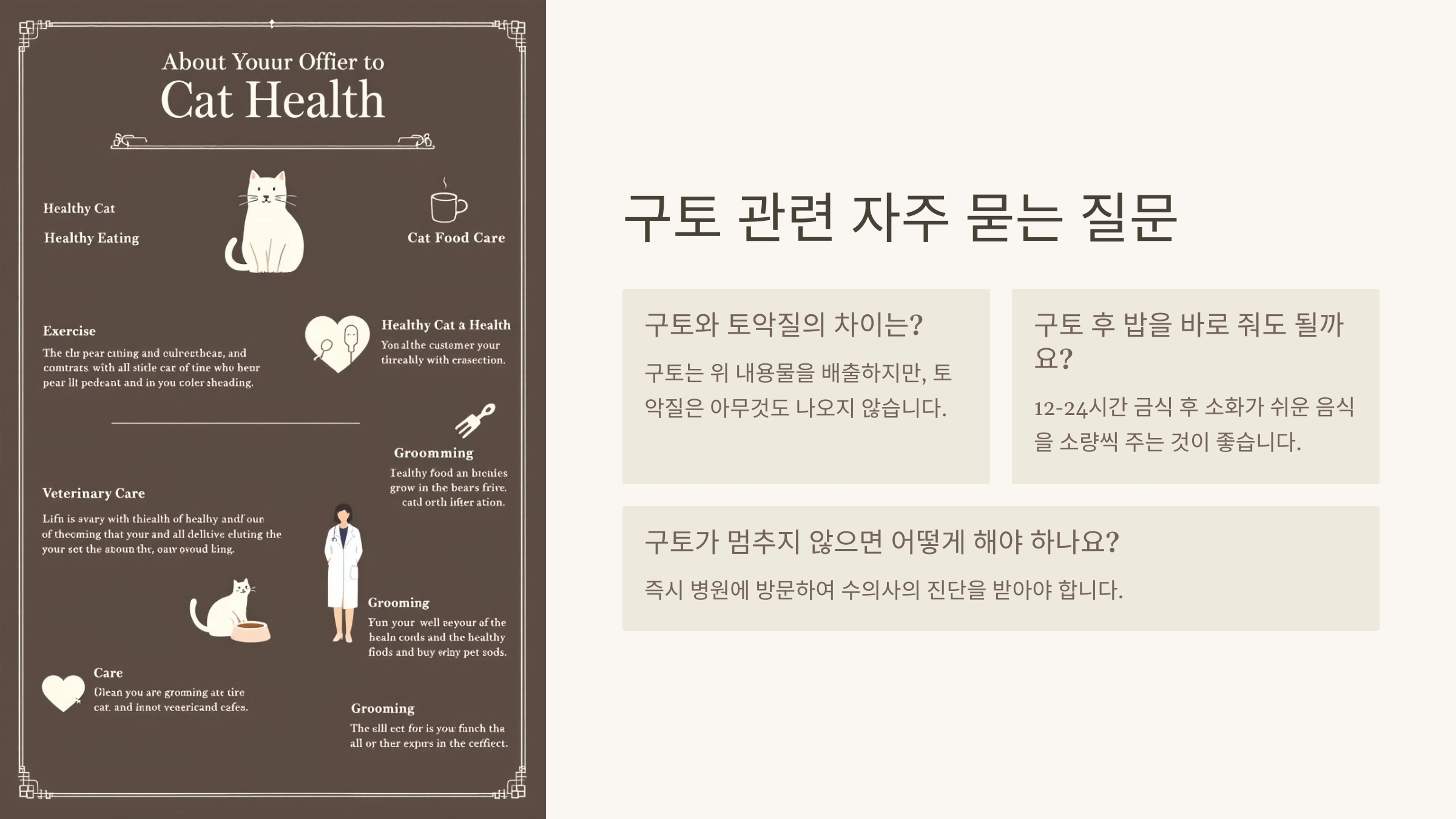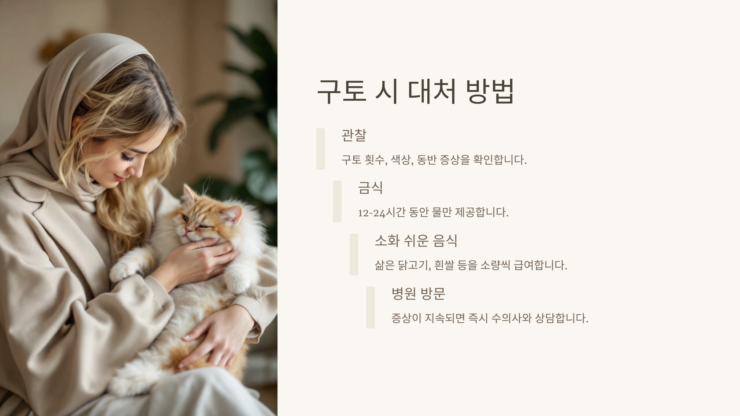 구토 유형을 확인하면 고양이의 건강 상태를 파악하는 데 도움이 돼요. 만약 구토가 반복되거나 이상한 색깔이 섞여 있다면 수의사 상담이 필요해요.