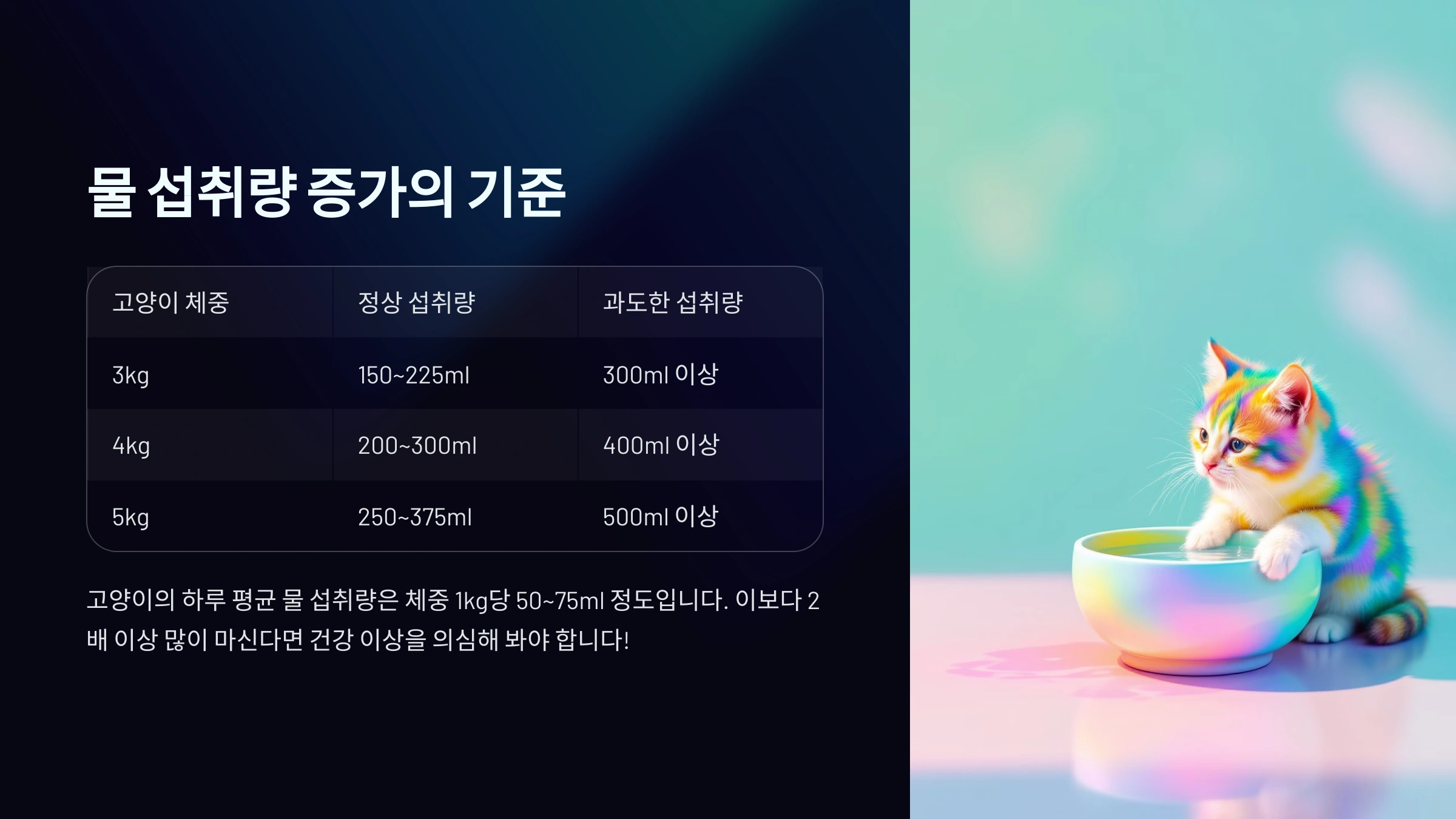 고양이의 하루 평균 물 섭취량은 체중 1kg당 50~75ml 정도예요. 만약 이보다 2배 이상 많이 마신다면 건강 이상을 의심해 봐야 해요! 🧐