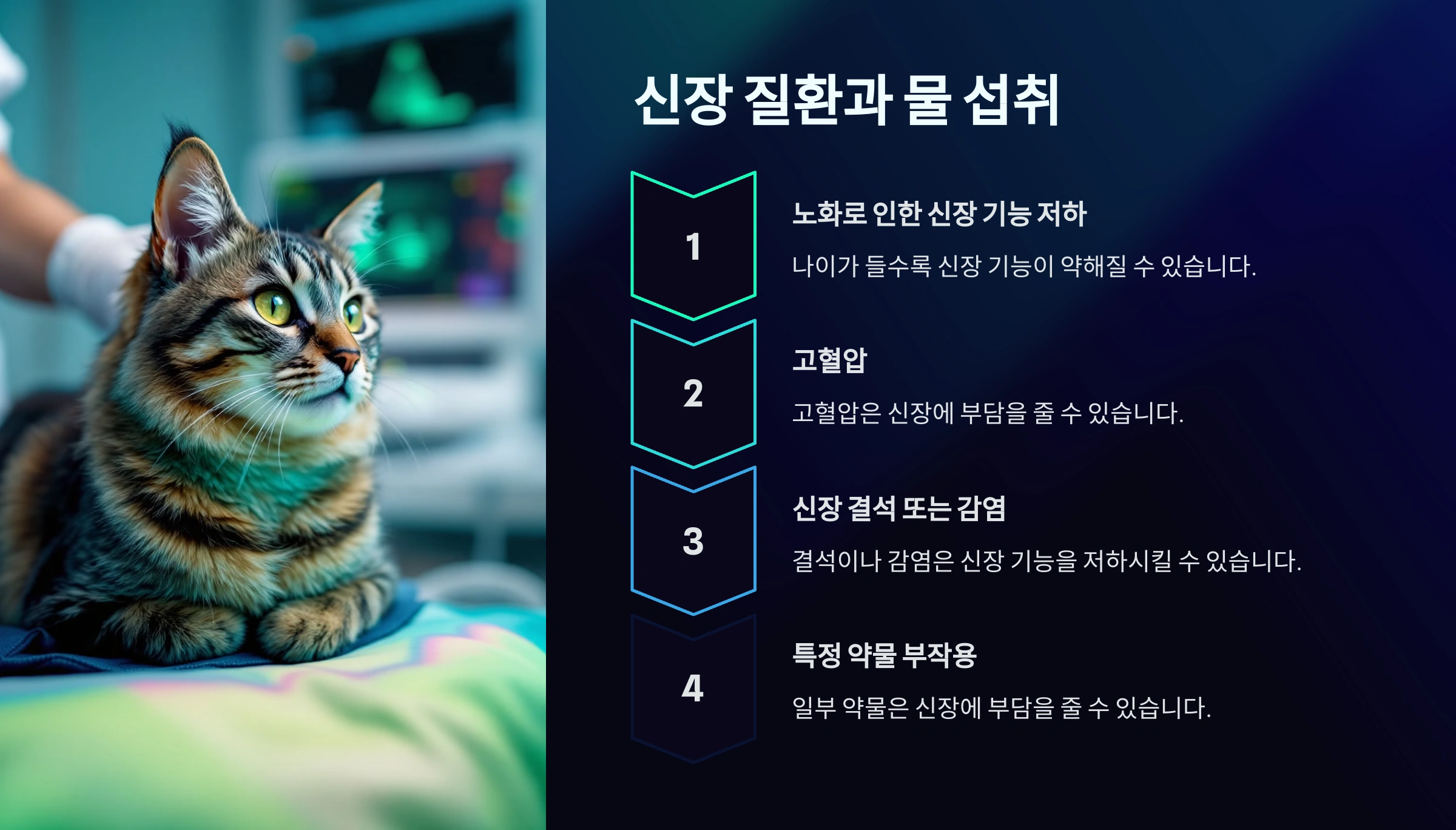 🐱 만성 신부전(신장 질환)은 나이가 많은 고양이들에게 흔히 발생하는 질환이에요. 신장이 노폐물을 제대로 걸러내지 못하면, 고양이는 몸에서 노폐물을 배출하려고 물을 더 많이 마시게 돼요.