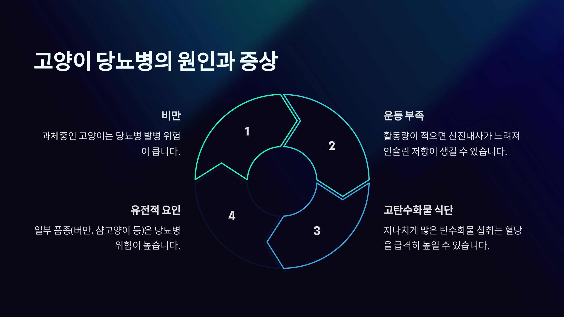 🐱 고양이 당뇨병은 인슐린 부족 또는 인슐린 저항으로 인해 발생하는 질병이에요. 혈당이 높아지면서 신장이 이를 배출하기 위해 더 많은 소변을 만들고, 고양이는 물을 더 많이 마시게 돼요.