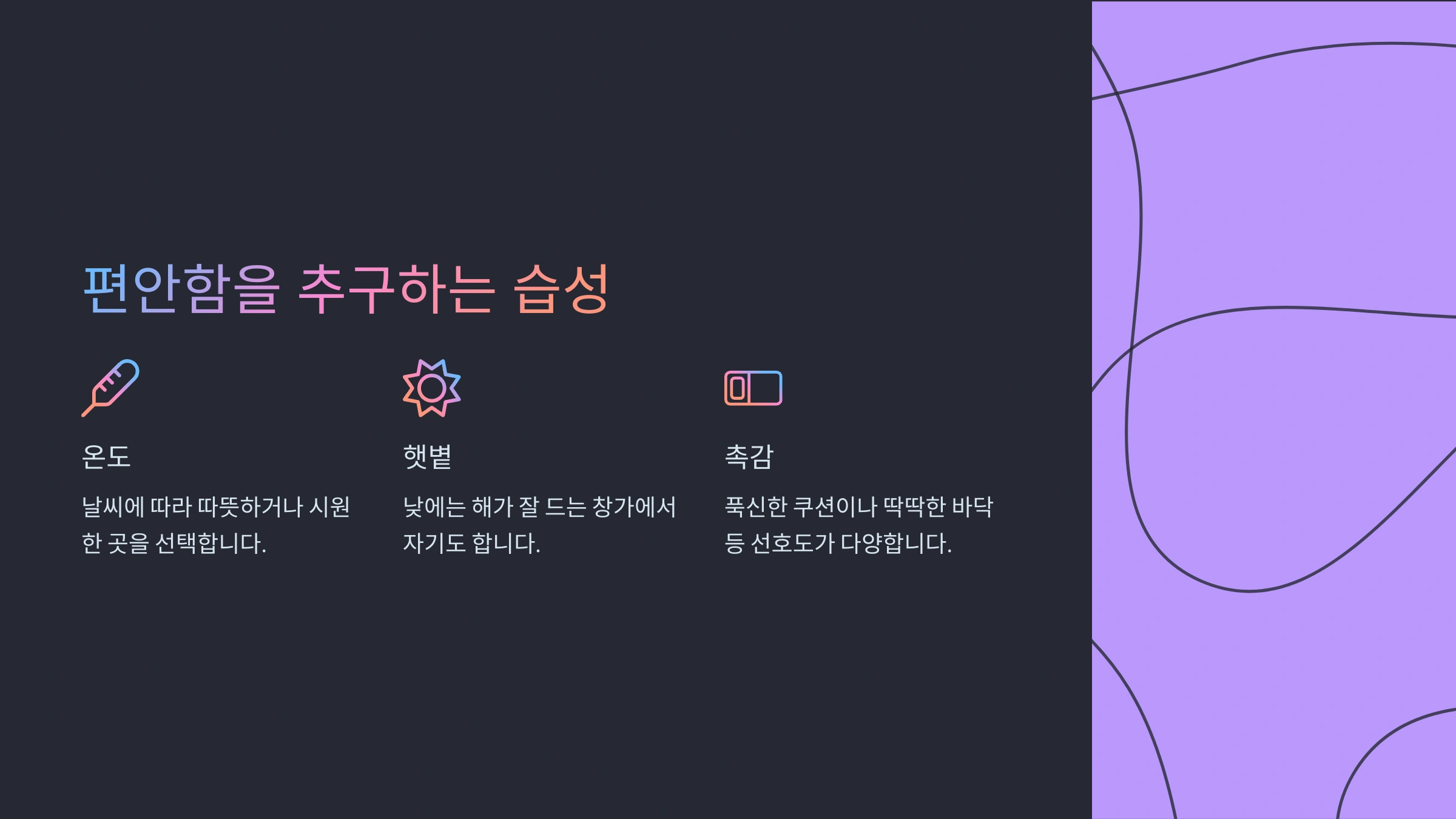 날씨가 추우면 따뜻한 곳으로 이동하고, 더우면 시원한 곳을 찾아가요. 예를 들어, 겨울에는 난방기구 근처에서 자고, 여름에는 타일 바닥이나 서늘한 창가로 이동하죠. 🌡️