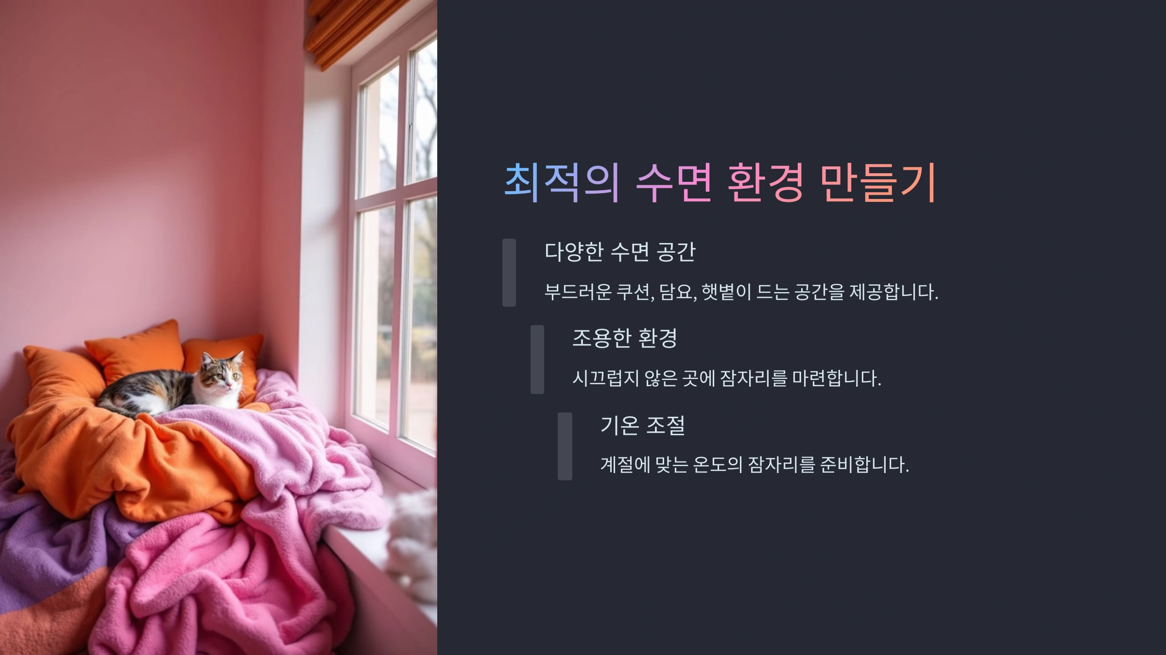 ✔️ 조용한 환경 유지: 고양이는 시끄러운 환경에서 편히 잘 수 없어요. 조용한 곳에 잠자리를 마련하는 것이 좋아요.