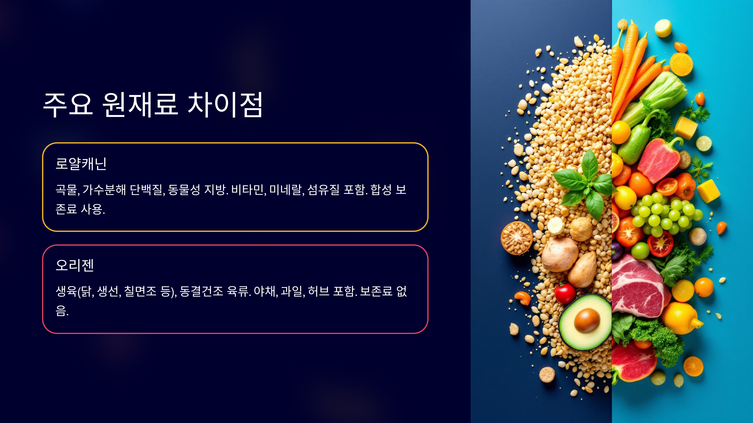 로얄캐닌은 **과학적 연구를 기반으로 맞춤형 영양 설계**를 제공하는 것이 강점이에요. 반면, 오리젠은 **자연식 개념**을 바탕으로 **고단백·고육류 함량**을 자랑하죠.