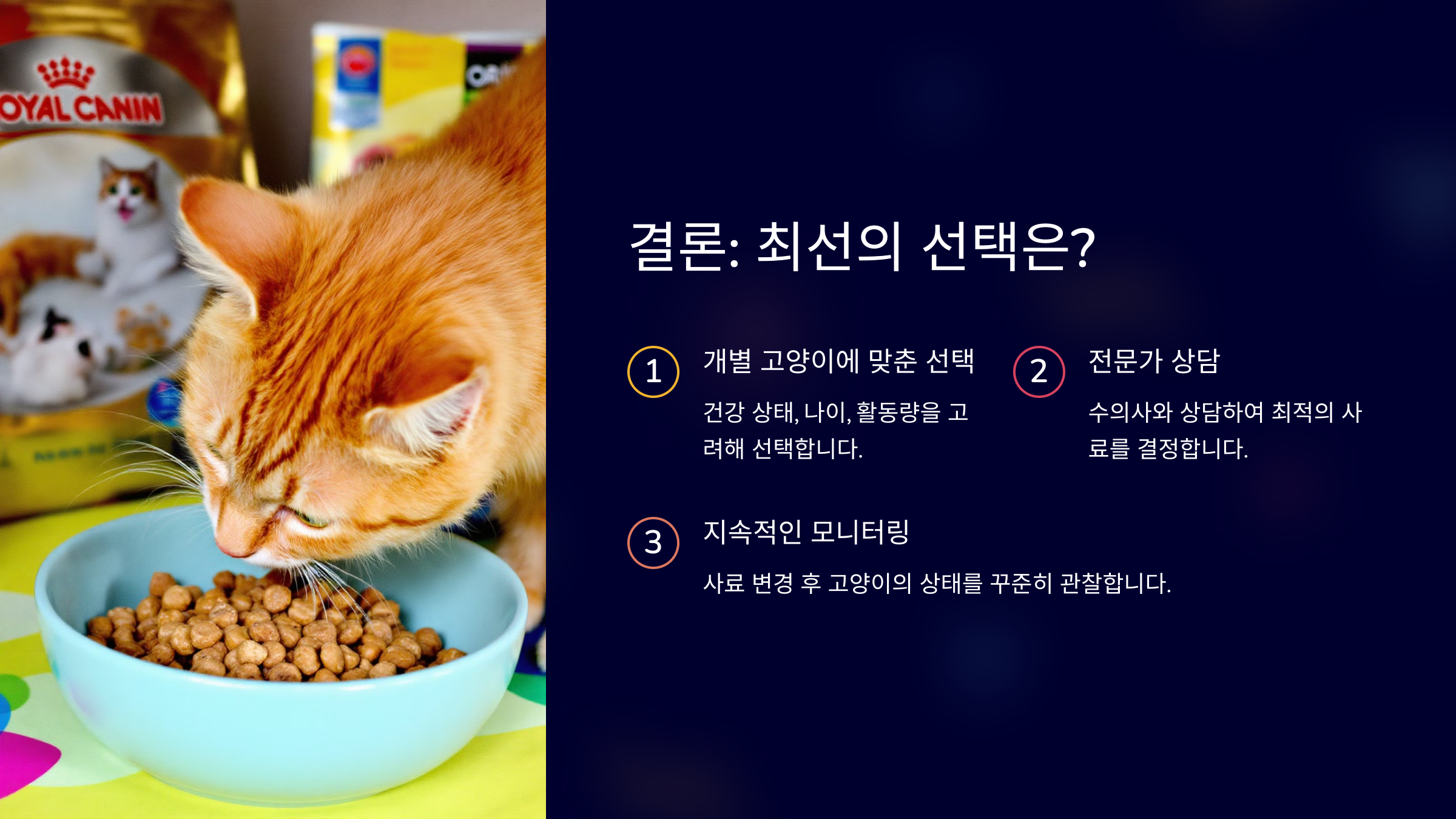 이제까지 살펴본 **로얄캐닌과 오리젠의 차이점**을 바탕으로, 우리 고양이에게 어떤 사료가 더 적합한지 정리해볼게요. **고양이의 건강 상태, 취향, 생활 방식에 따라 선택이 달라질 수 있어요!**