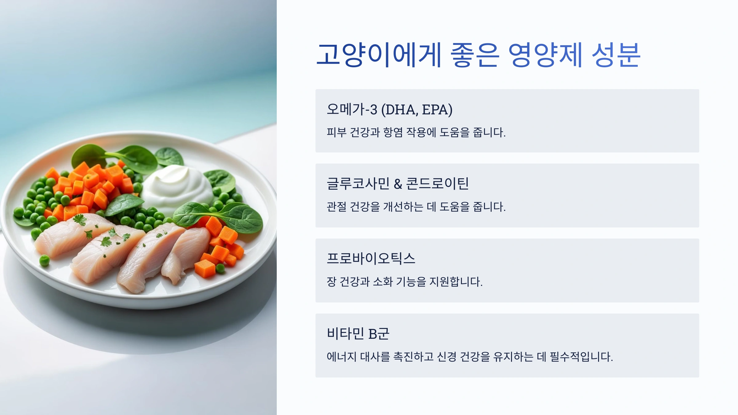 🐟 단백질: 고양이는 개보다 더 많은 단백질을 필요로 해요. 특히 동물성 단백질이 중요하죠.