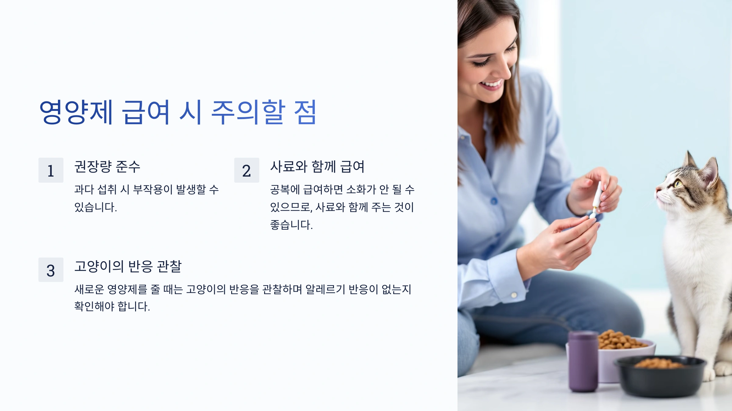 ⚠️ 고양이의 반응 관찰: 새로운 영양제를 줄 때는 고양이의 반응을 관찰하며 알레르기 반응이 없는지 확인해야 해요.