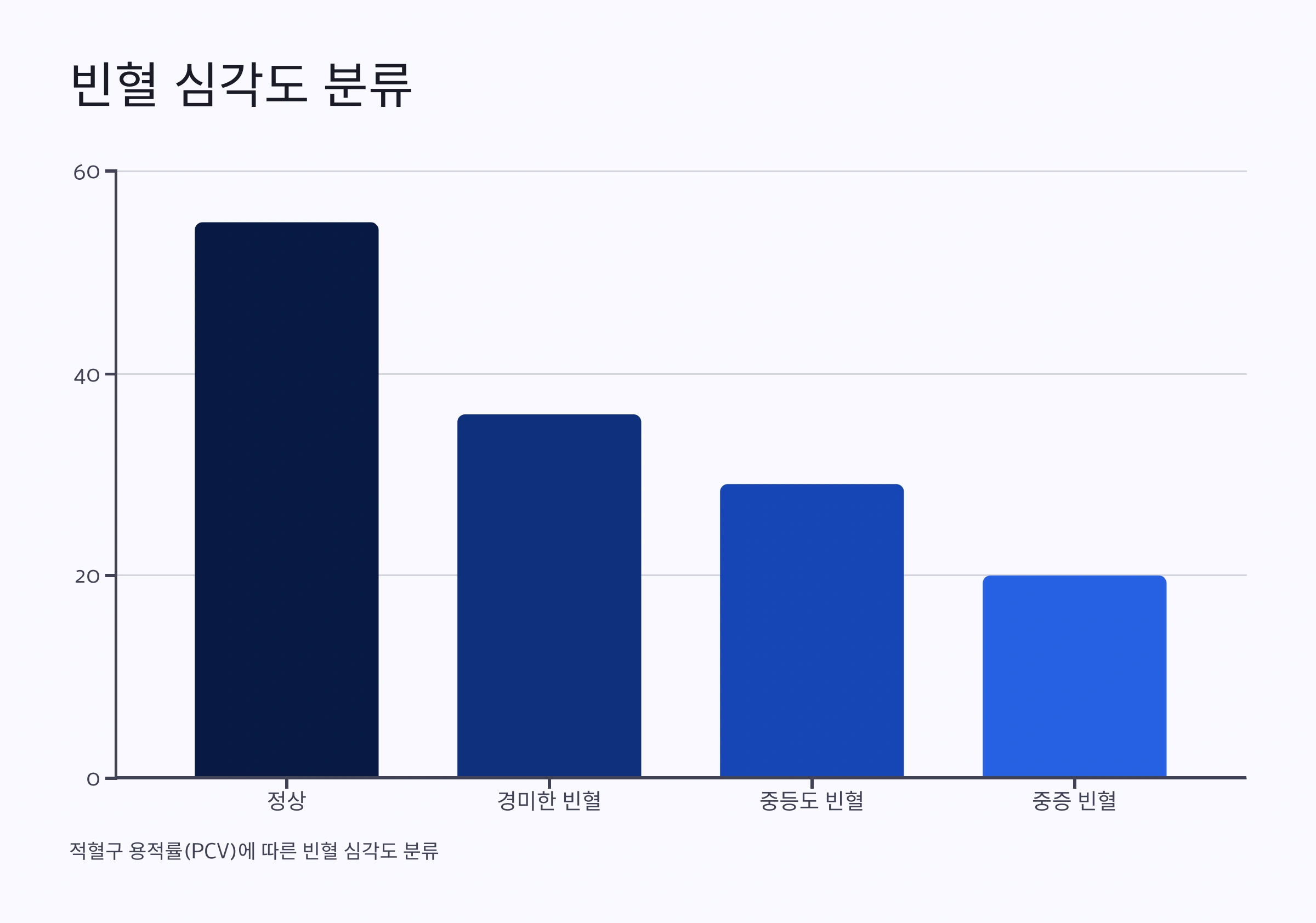 | 빈혈 심각도 | 적혈구 용적률(PCV) | 설명 |