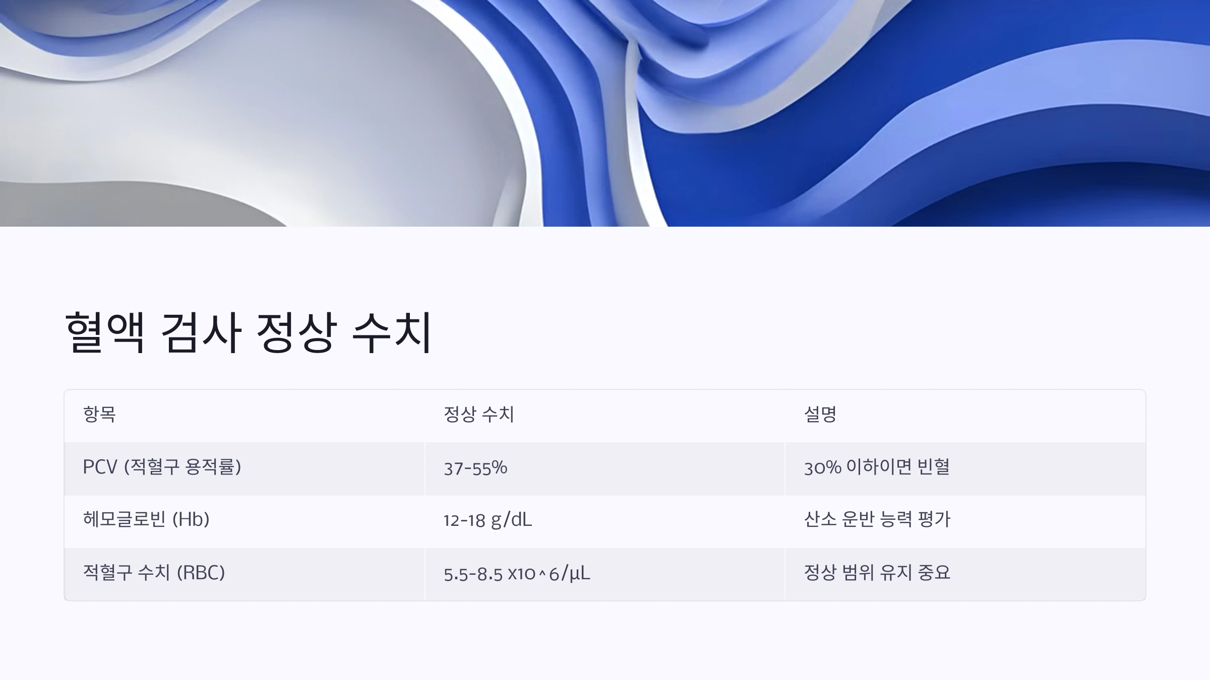 A1. 빈혈이 심할 경우 장기에 산소 공급이 부족해져 치명적일 수 있어요. 특히 적혈구 용적률(PCV)이 20% 이하라면 응급 치료가 필요해요.