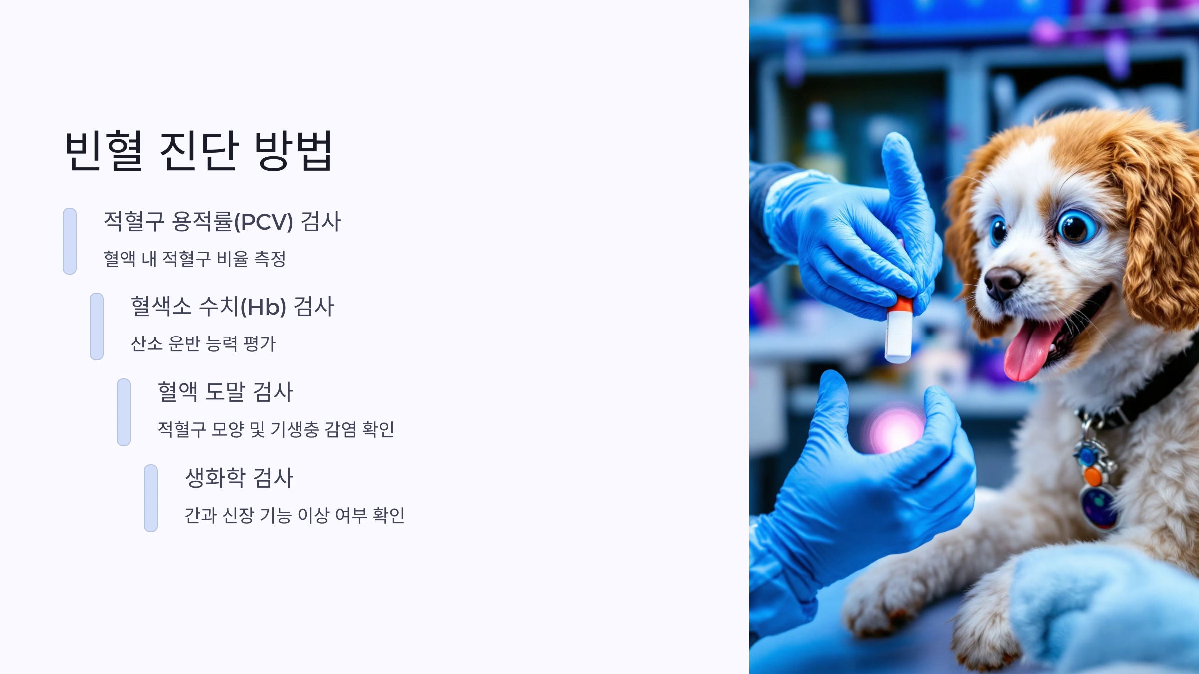 강아지 빈혈을 정확하게 진단하려면 동물병원에서 혈액 검사를 받아야 해요. 주요 검사 방법은 다음과 같아요.