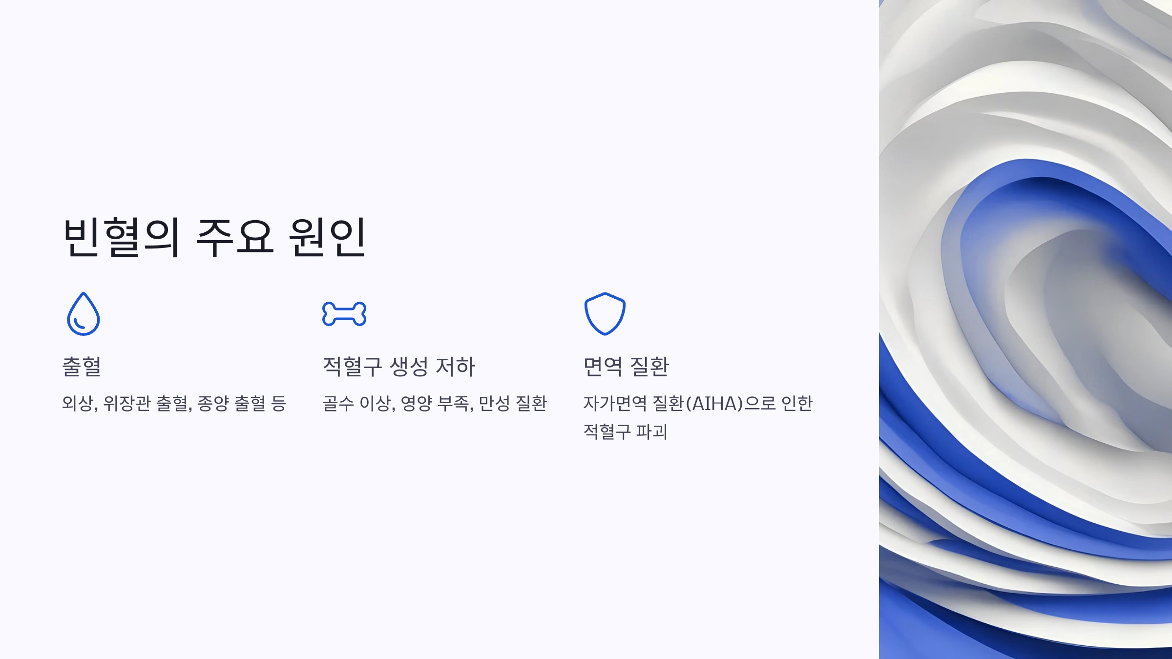 빈혈은 여러 가지 원인에 의해 발생할 수 있어요. 출혈, 적혈구 생성 저하, 면역계 이상 등으로 인해 혈액 속 산소 운반 능력이 떨어지면 빈혈 증상이 나타날 수 있어요.