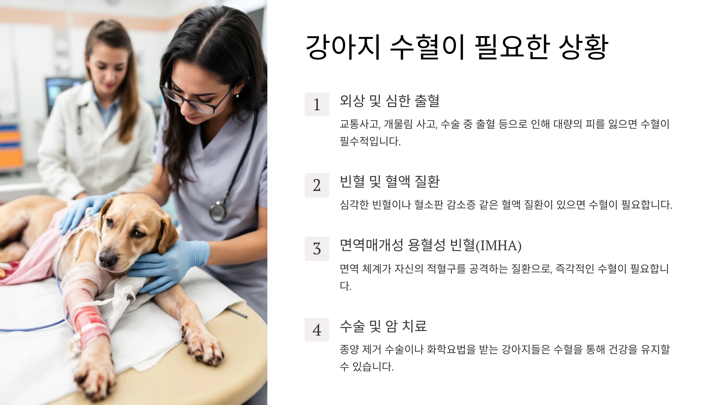 강아지의 수혈은 생명을 구하는 중요한 치료법이에요. 특히 심한 출혈이나 혈액 관련 질환을 가진 강아지에게 꼭 필요해요. 대표적인 상황을 살펴보면 다음과 같아요.