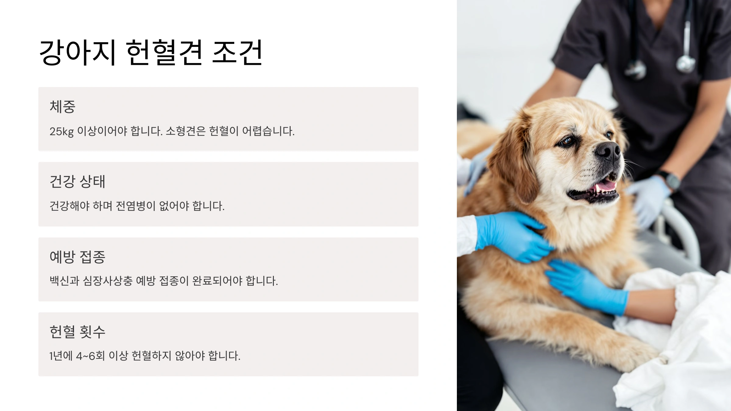 건강한 강아지는 수혈이 필요한 친구들을 돕기 위해 헌혈견이 될 수 있어요. 하지만 모든 강아지가 헌혈할 수 있는 것은 아니며, 몇 가지 조건을 충족해야 해요.