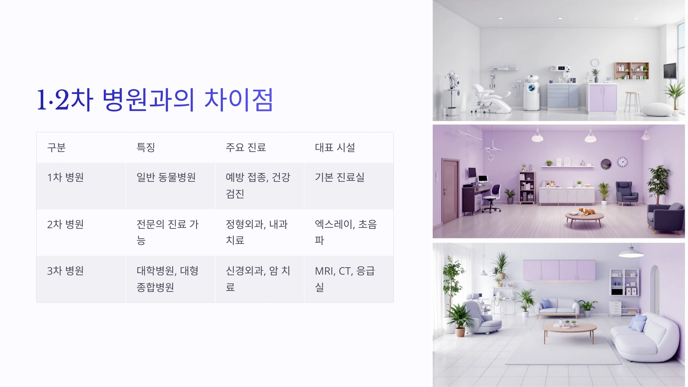 이렇게 단계별로 병원의 역할이 다르기 때문에, 반려동물의 증상에 맞춰 병원을 선택하는 것이 중요해요. 단순 감기라면 1차 병원, 정밀 검사가 필요하면 2차 병원, 중증 질환이면 3차 병원을 방문하는 것이 좋아요.
