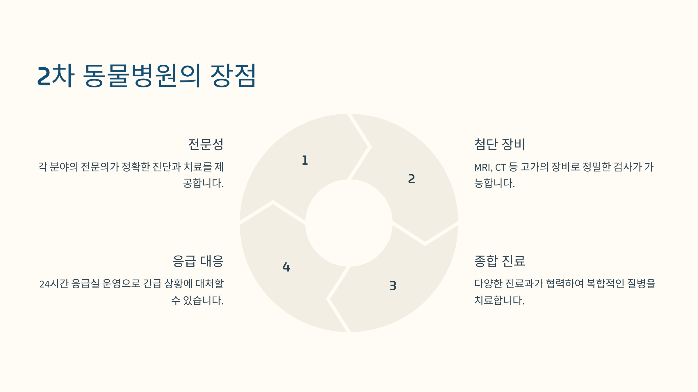 쉽게 말해 **사람의 종합병원** 같은 개념이에요. 반려동물이 일반 병원에서 치료받다가 추가적인 검사나 수술이 필요할 때 2차 병원으로 의뢰되죠.