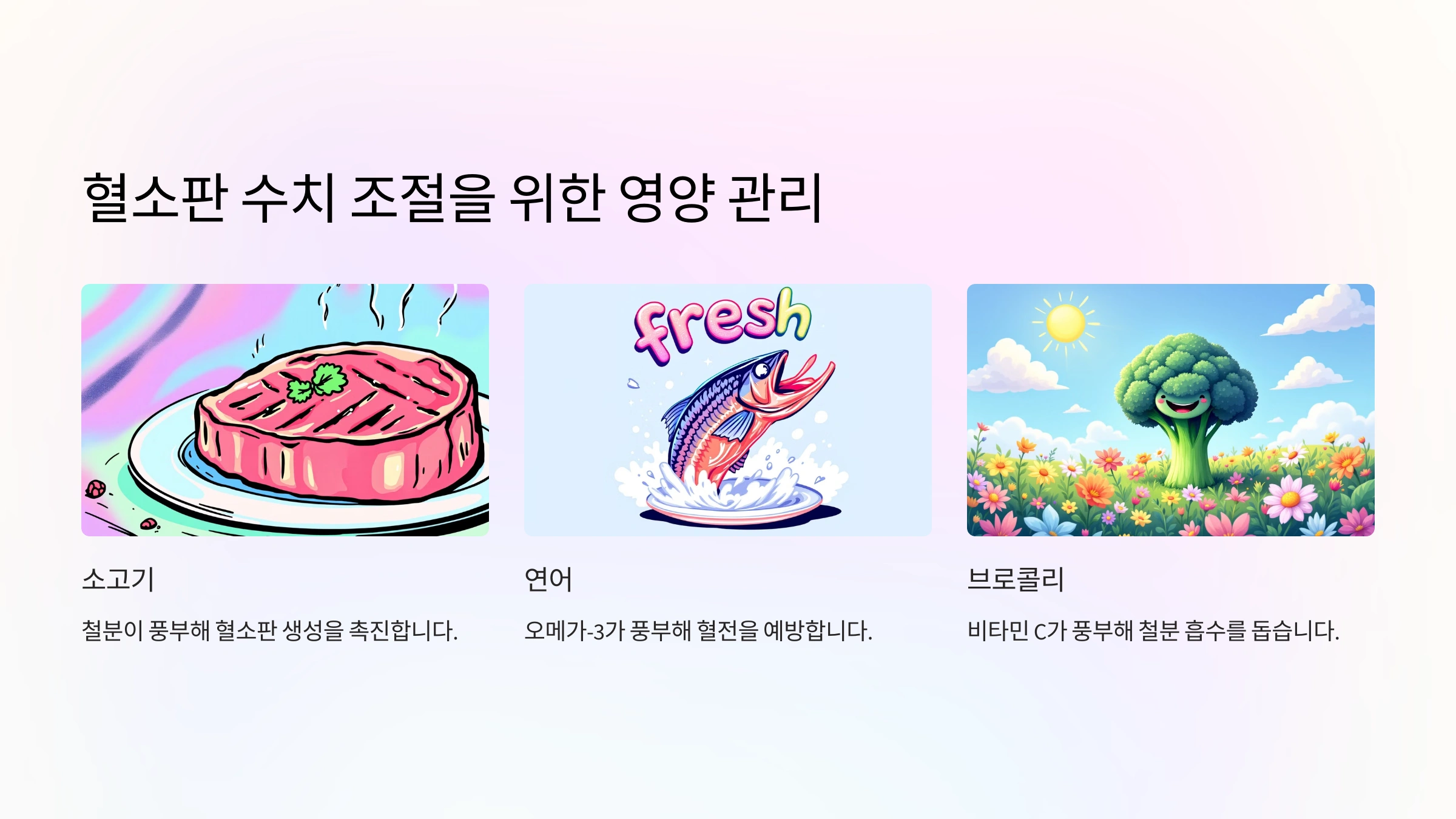 - 비타민 C: 철분 흡수를 돕고 면역력을 높이는 채소와 과일 (파프리카, 브로콜리) 추천!