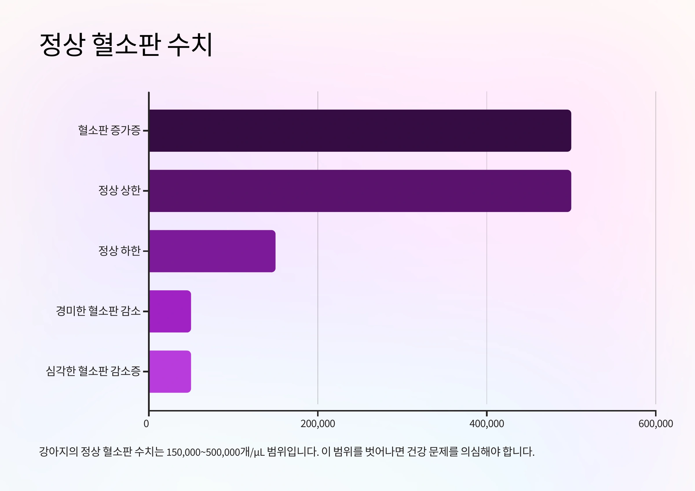 강아지의 정상 혈소판 수치는 보통 150,000~500,000개/μL 범위에요. 하지만 이 범위는 개별 강아지의 건강 상태나 검사 방법에 따라 약간의 차이가 있을 수 있어요.