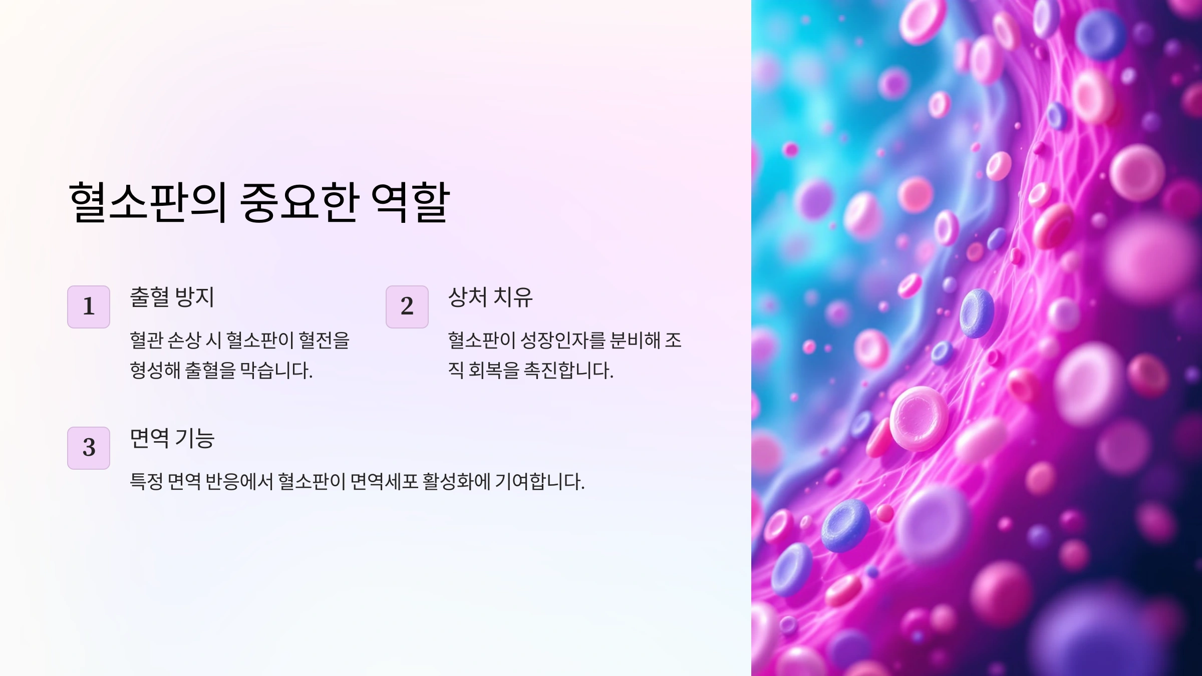 • 상처 치유: 혈소판이 분비하는 성장인자가 조직 재생을 도와요.
