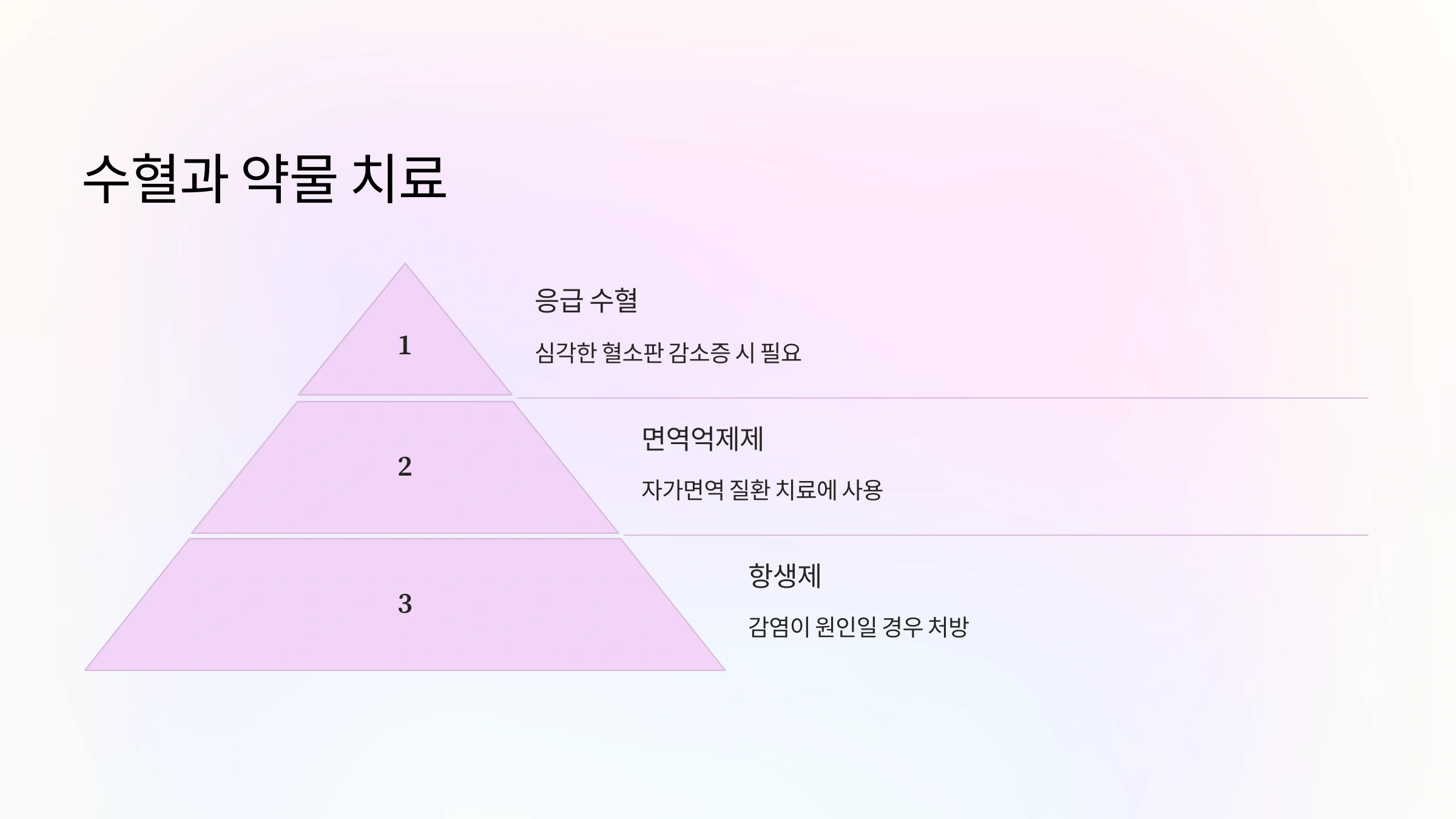 • 수혈: 심각한 혈소판 감소증일 경우, 혈소판 농축액을 수혈해요.