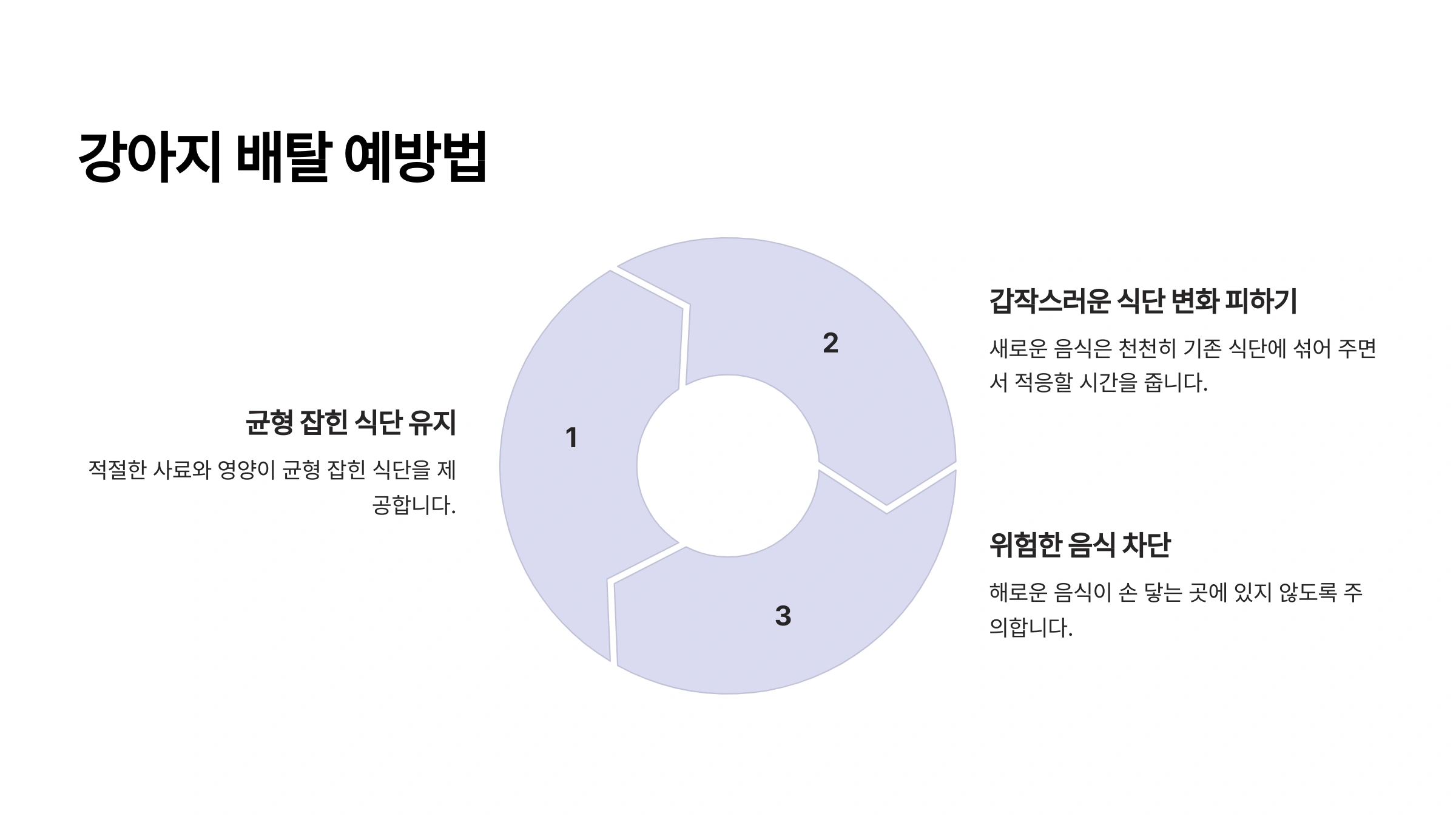 | 급격한 식단 변화 | 새로운 음식이 갑자기 추가됨 | 천천히 적응할 시간 제공 |