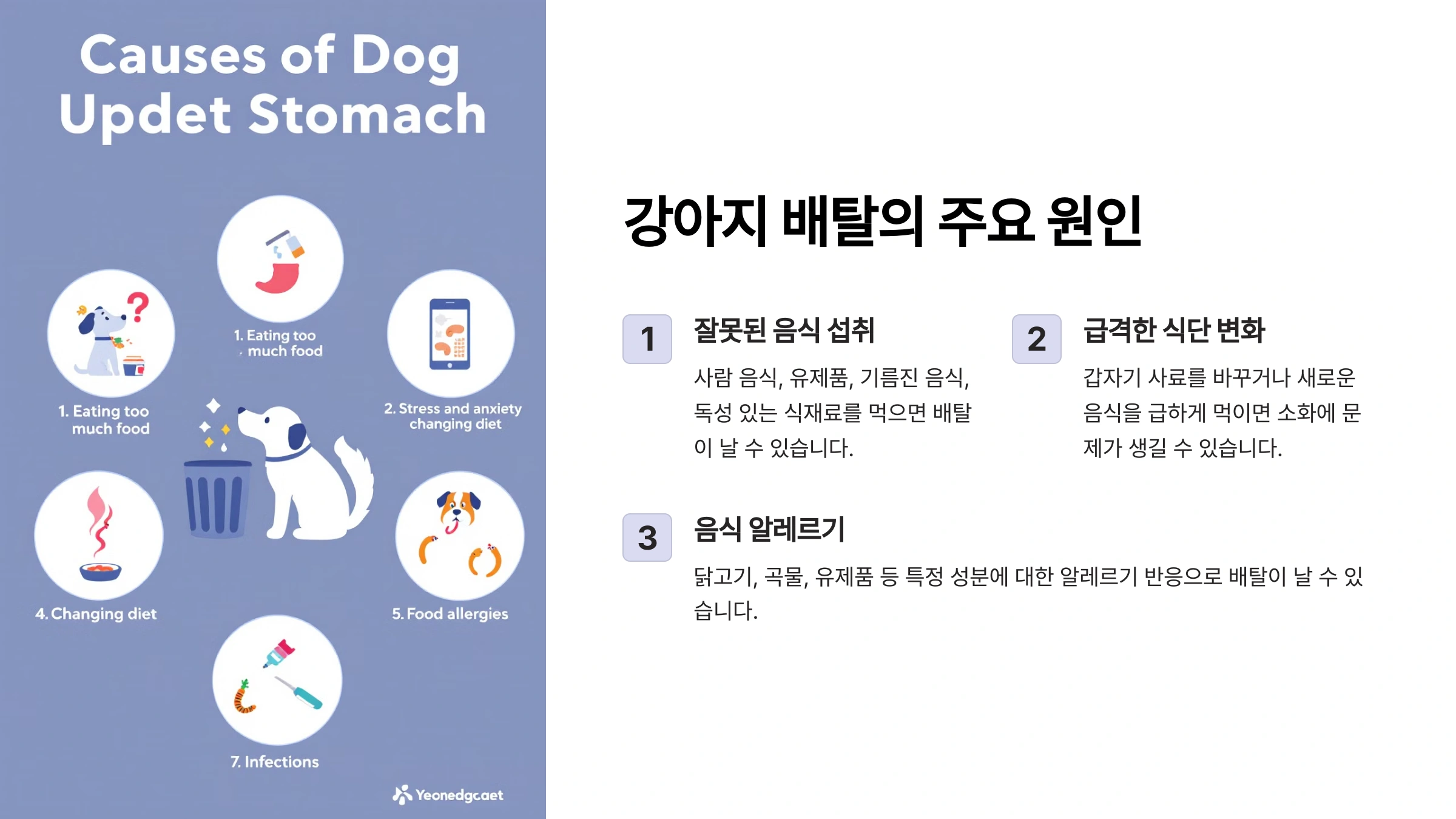 1. 잘못된 음식 섭취: 사람 음식이나 유제품, 기름진 음식, 독성이 있는 식재료를 먹으면 배탈이 날 수 있어요.