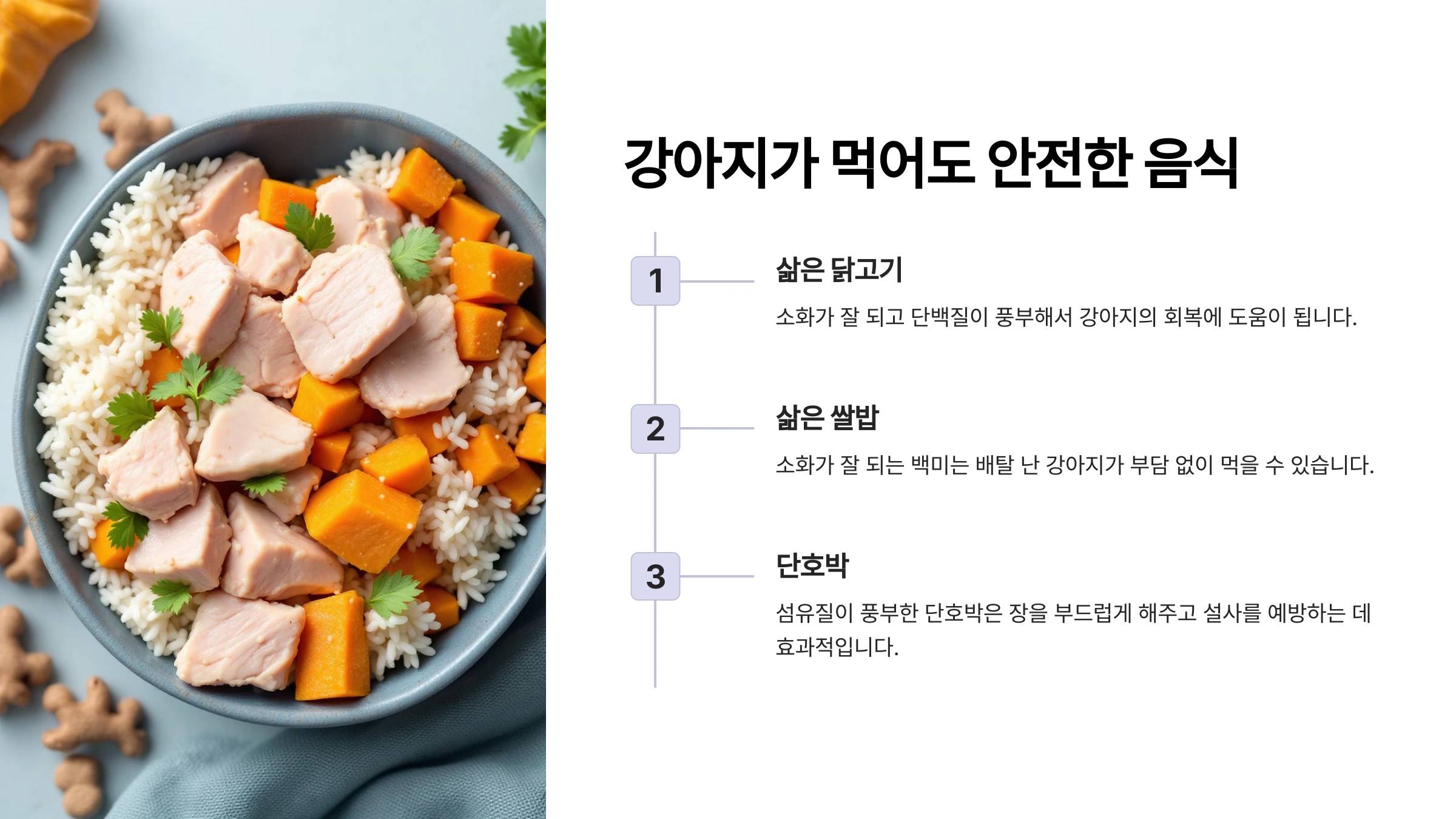 | 삶은 닭고기 | 소화에 좋음 | 단백질 공급 |
