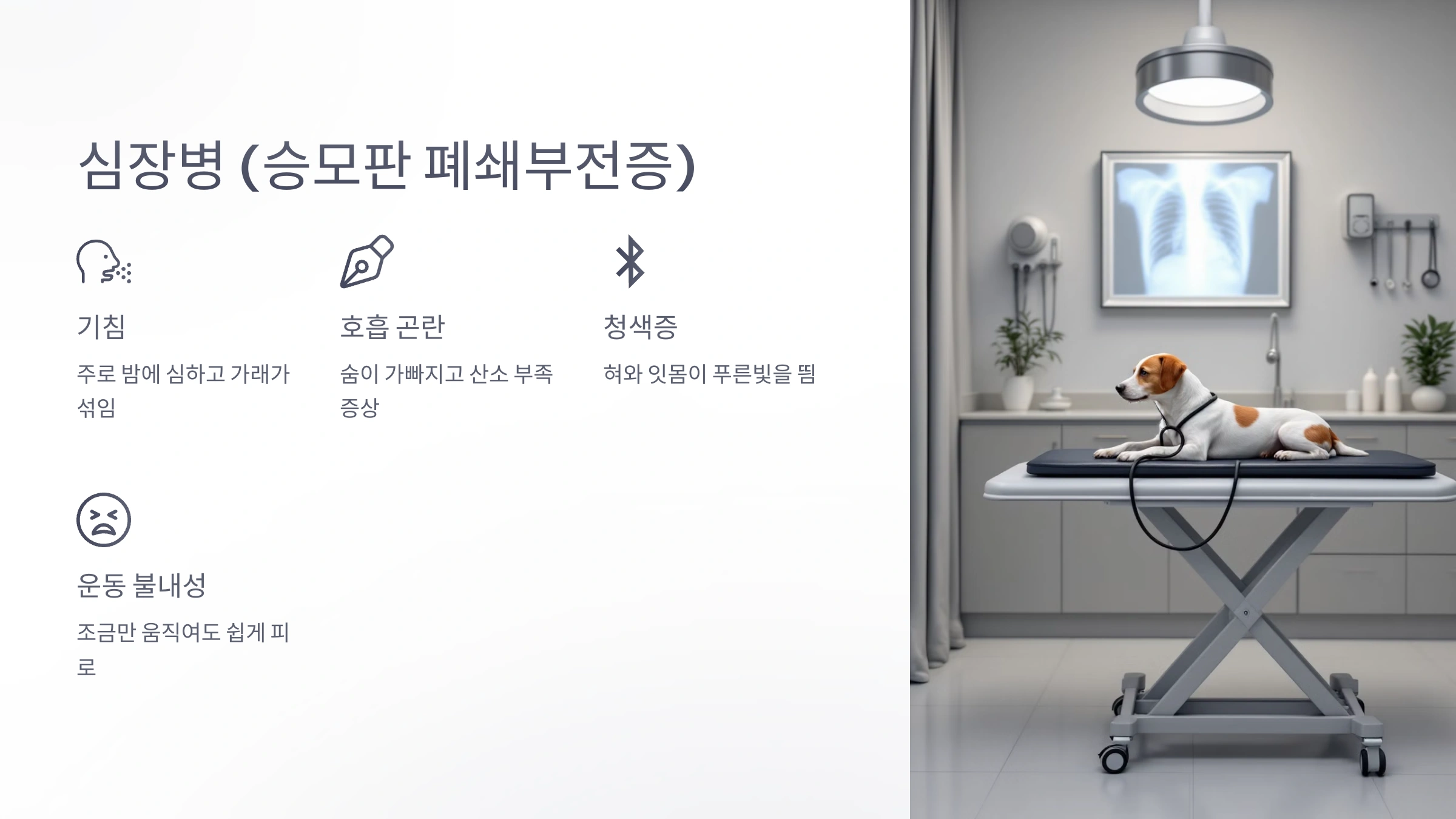🔔 만약 강아지가 밤에 자주 기침을 하고, 쉽게 피로해하거나 호흡이 힘들어 보인다면 심장 질환을 의심해 보고 병원에 방문하세요!