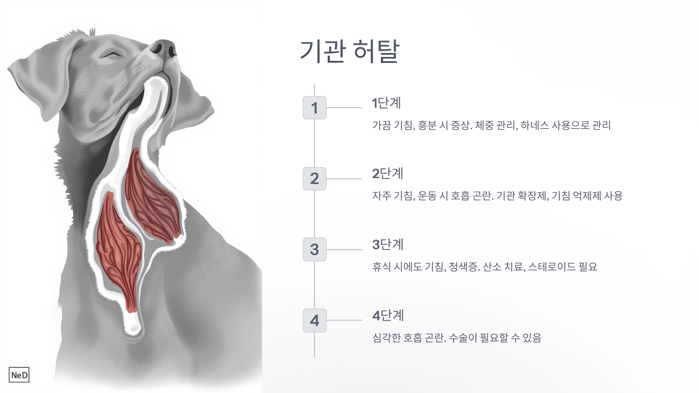 | 1단계 | 가끔 기침, 흥분 시 증상 | 체중 관리, 하네스 사용 |
