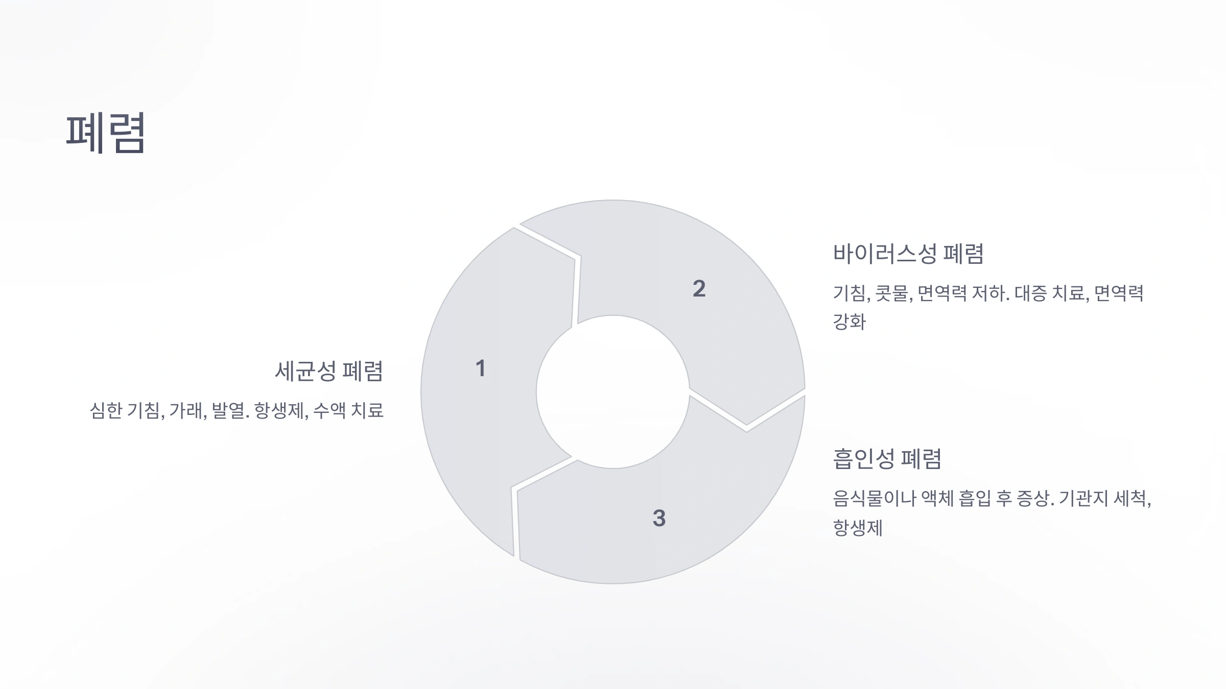 | 바이러스성 폐렴 | 기침, 콧물, 면역력 저하 | 대증 치료, 면역력 강화 |