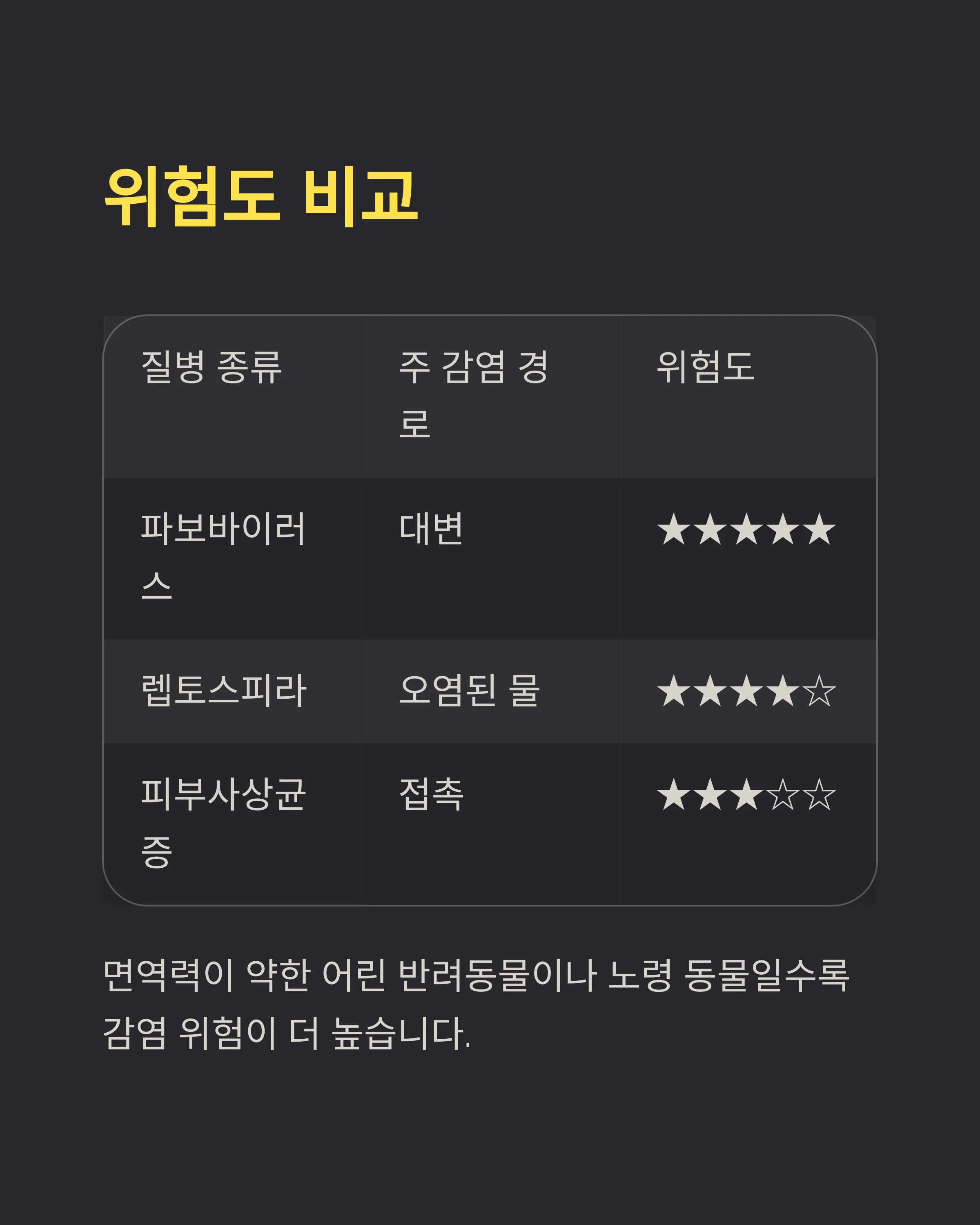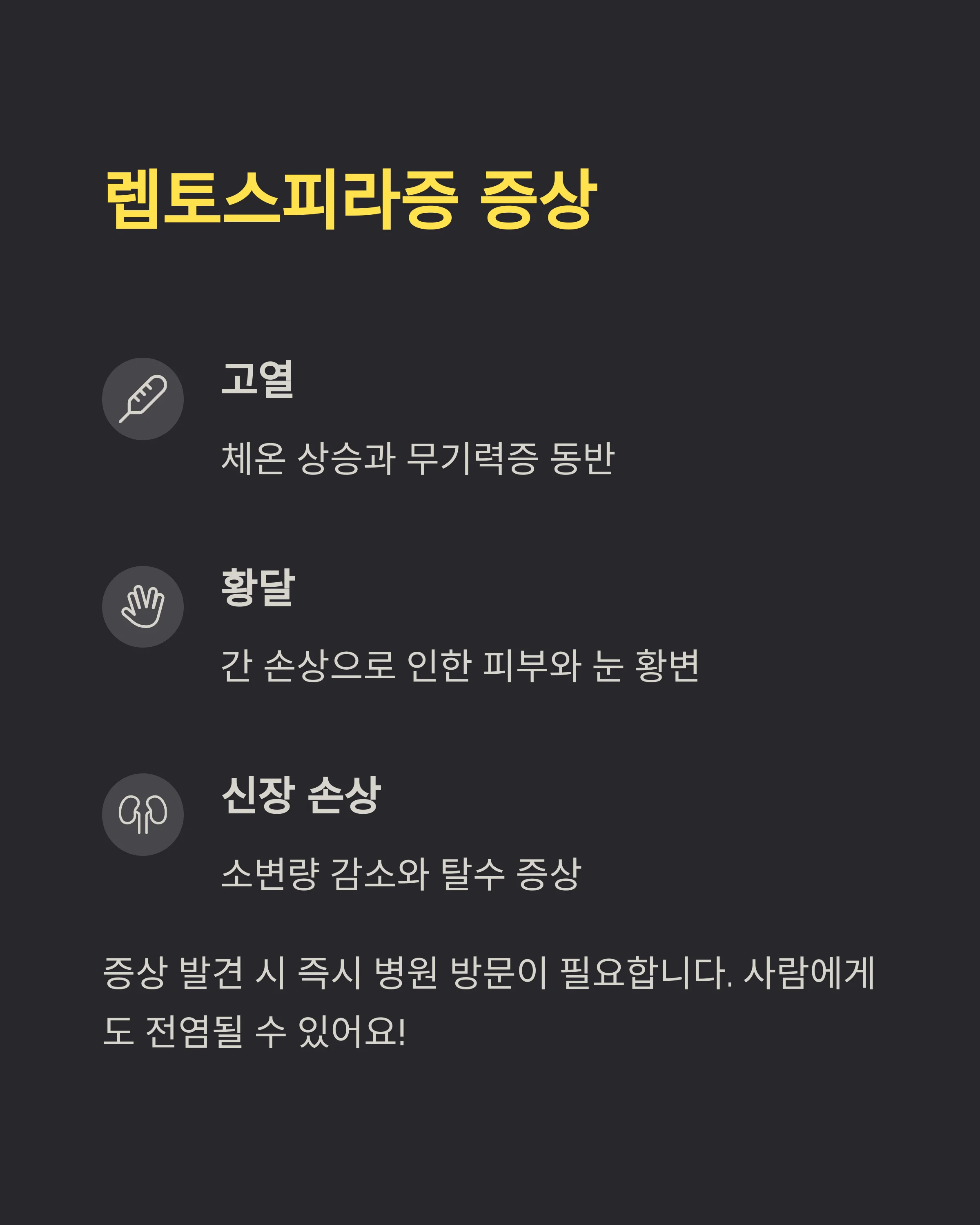 | 렙토스피라증 | 무기력, 고열, 황달 | 근육통, 고열, 간 손상 |