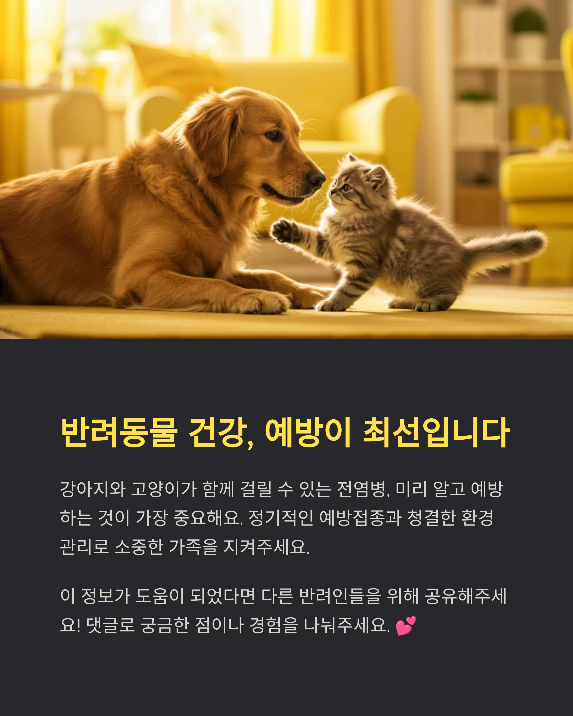 특히 다묘, 다견 가정이거나 강아지와 고양이를 함께 키우는 가정에서는 한 마리의 감염이 다른 아이에게 전파될 위험도 높아지죠. 내가 생각했을 때 이런 정보는 반려인을 위한 필수 상식이라고 느껴졌어요. 이번 글에서는 강아지와 고양이가 함께 걸릴 수 있는 전염병 중에서도 특히 주의해야 할 5가지를 중심으로 알아볼게요.