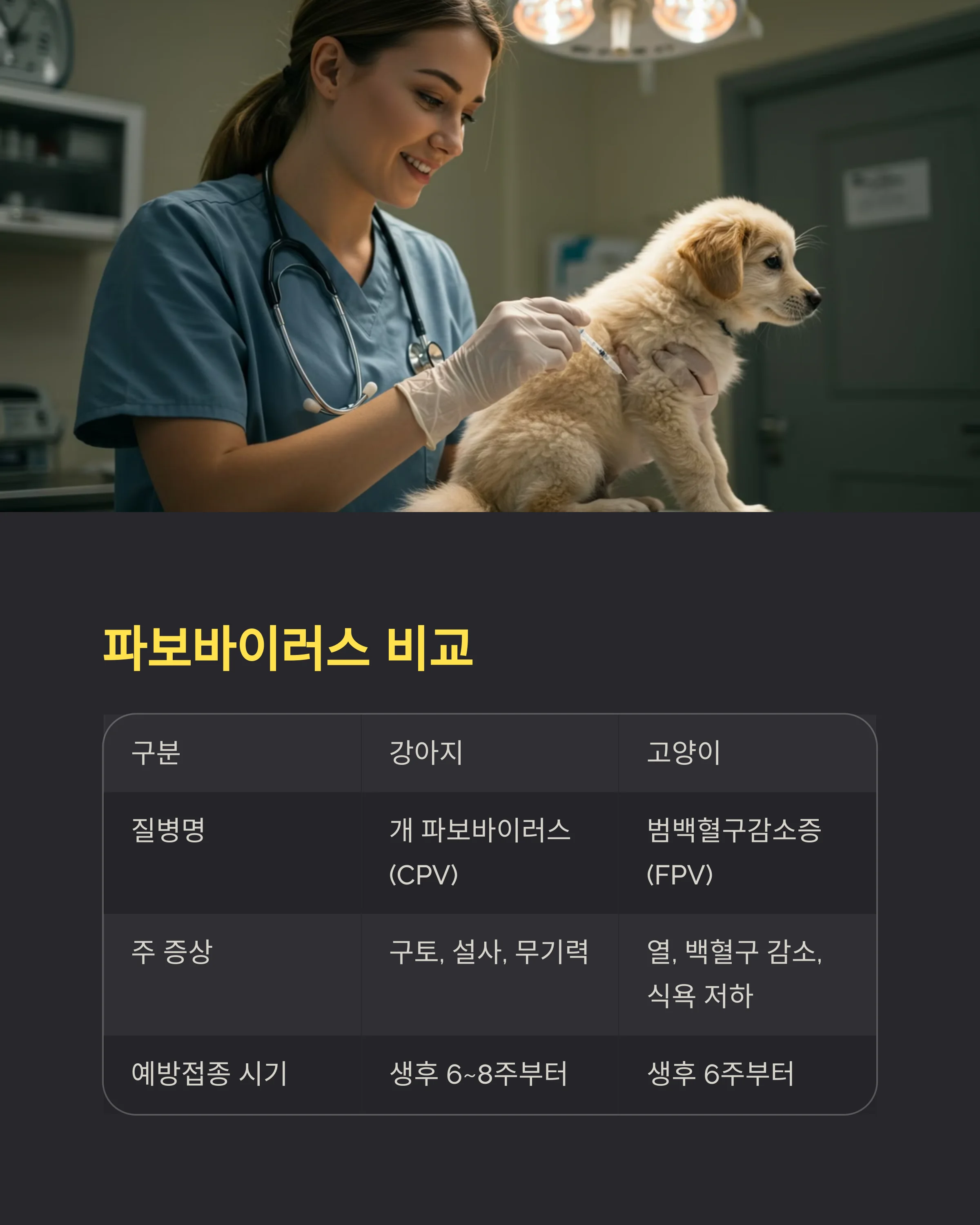 파보바이러스는 강아지와 고양이 모두에게 치명적인 바이러스 질환이에요. 특히 어린 반려동물에게 감염되면 생명까지 위협할 수 있을 만큼 무서운 병이죠. 강아지에게는 ‘개 파보바이러스(CPV)’, 고양이에게는 ‘범백혈구감소증(FPV)’이라는 이름으로 알려져 있어요.