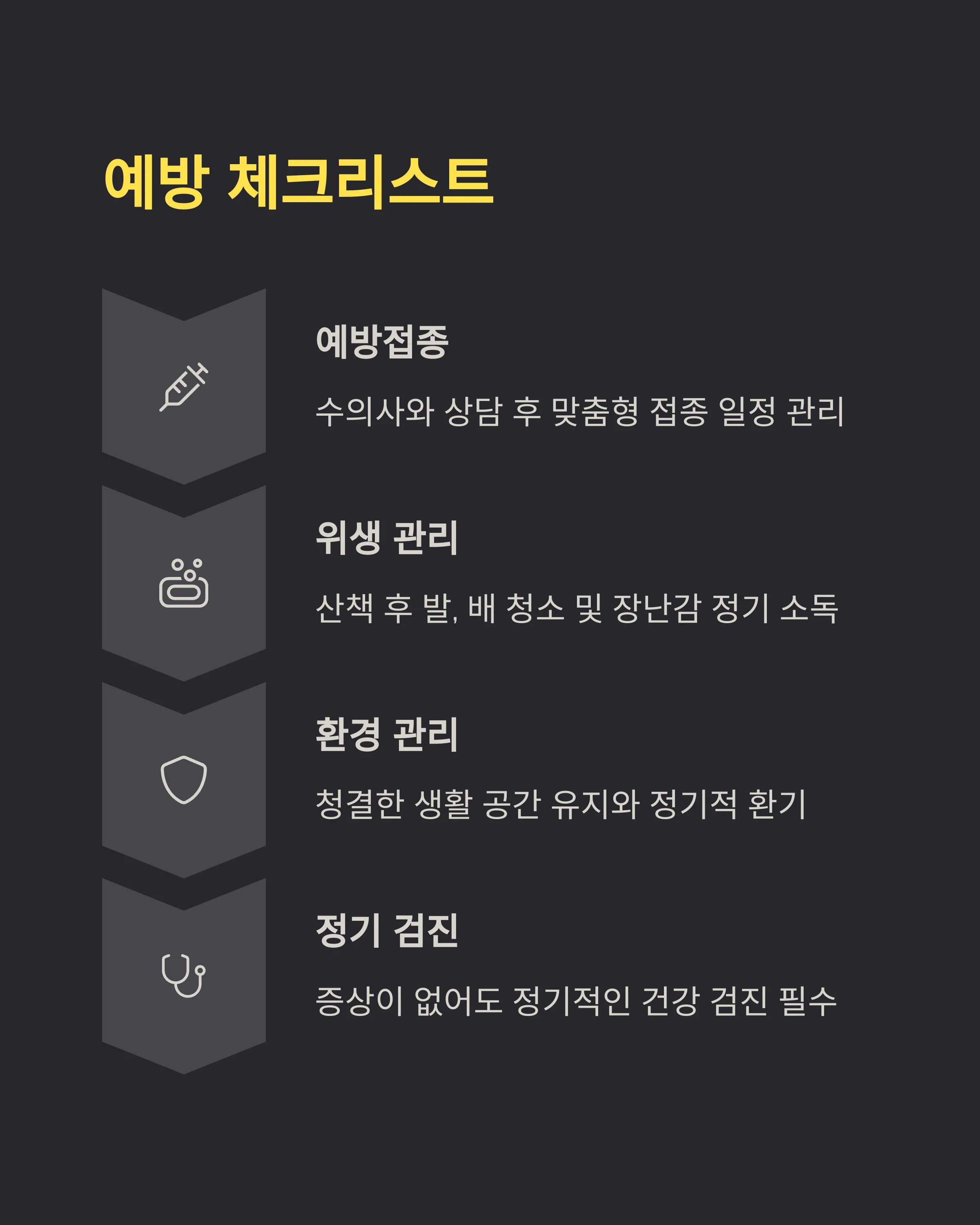 생활 공간을 청결하게 유지하고, 다묘/다견 가정에서는 신입 반려동물을 들이기 전 격리 및 검사를 진행하는 것도 매우 중요한 예방 수칙이에요. 위생과 예방, 이 두 가지가 우리 반려 친구들의 건강을 지키는 가장 큰 무기랍니다! 🐾