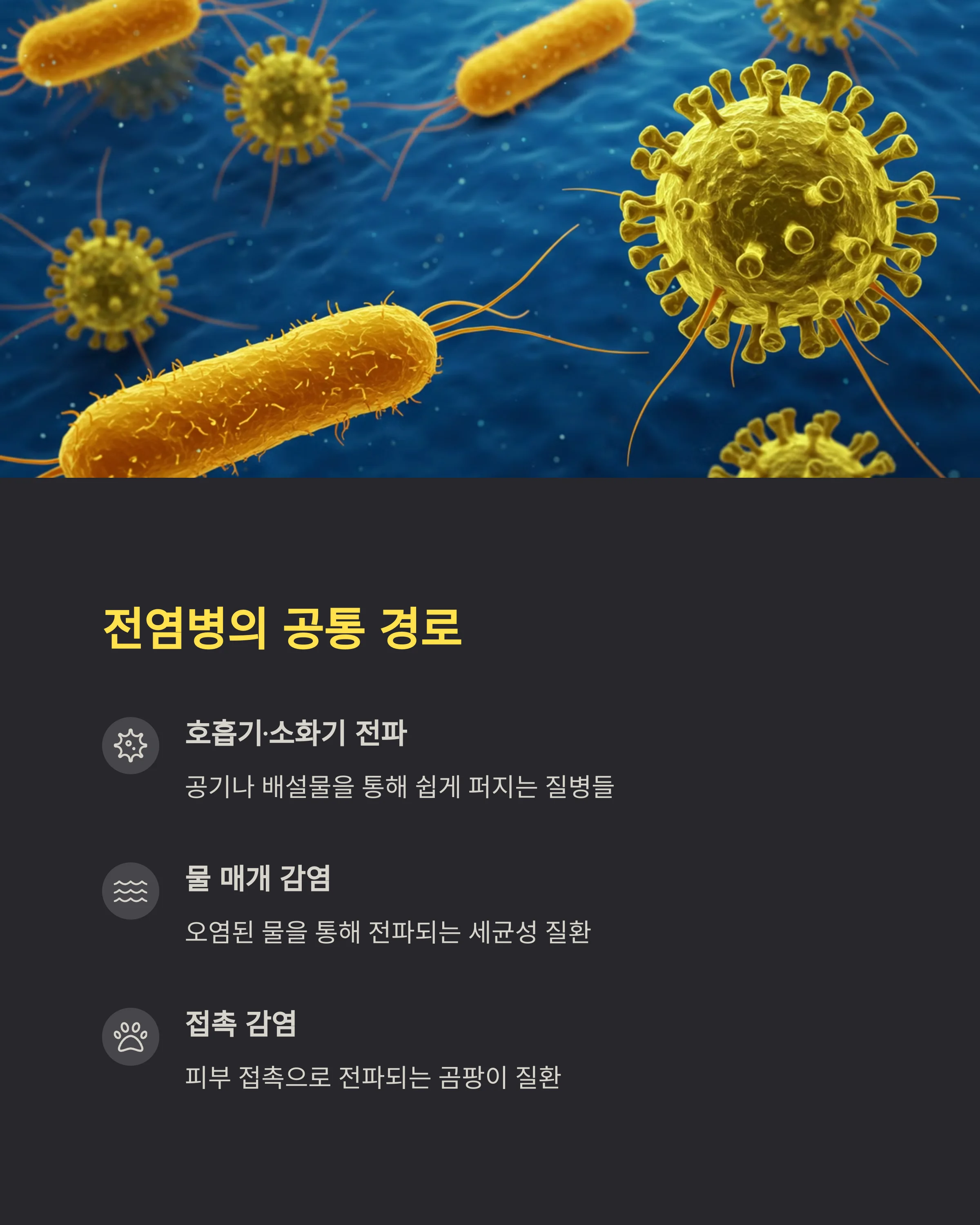 대표적인 예로는 피부에 생기는 곰팡이 질환, 물을 매개로 퍼지는 세균 감염, 대변을 통해 퍼지는 바이러스 등이 있어요. 특히 면역력이 약한 어린 반려동물이나 노령 동물일수록 감염 위험이 더 높고, 한 번 걸리면 회복도 더딜 수 있어요.
