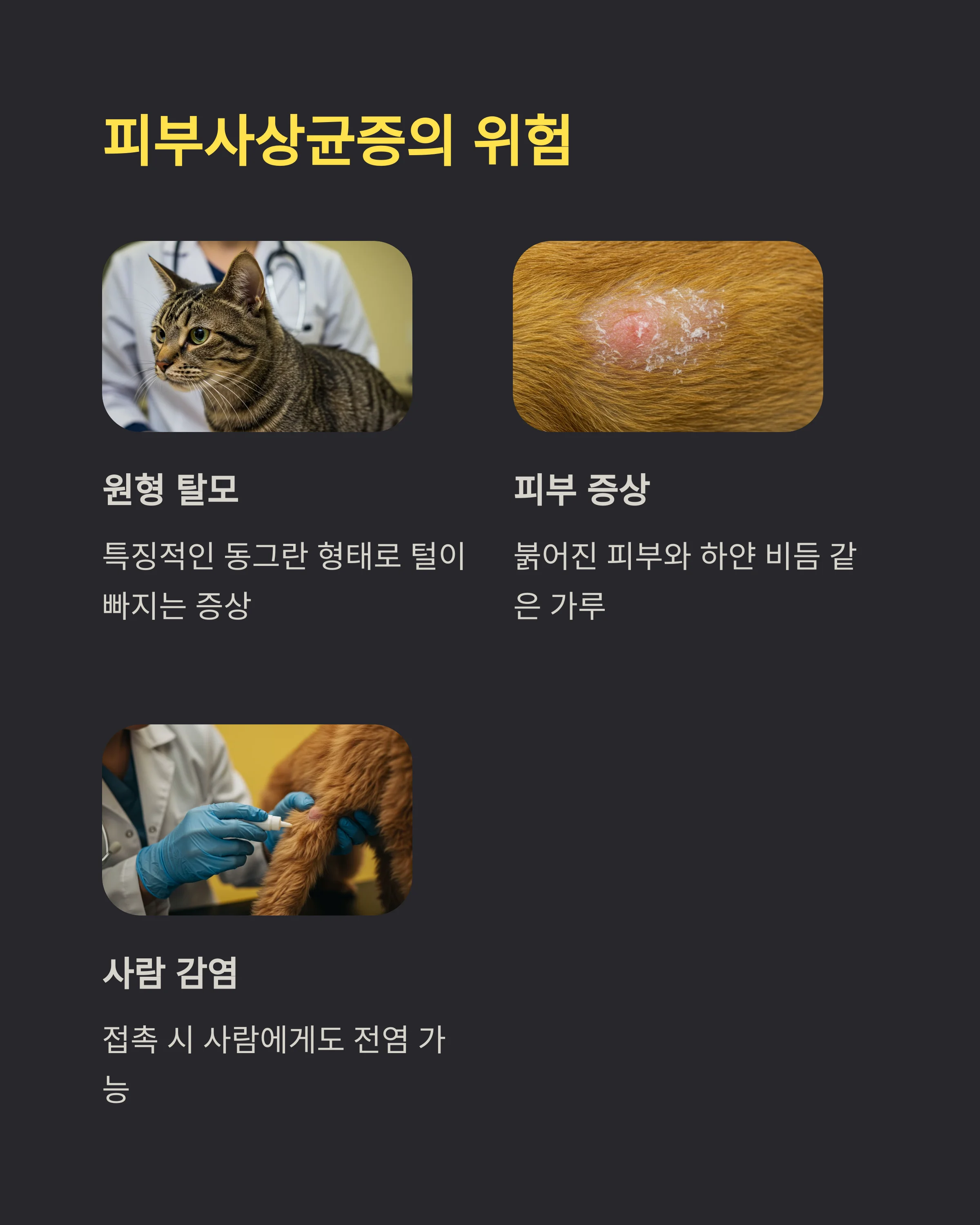 | 피부사상균증 | 탈모, 가려움 | 원형 탈모, 붉은 반점 |