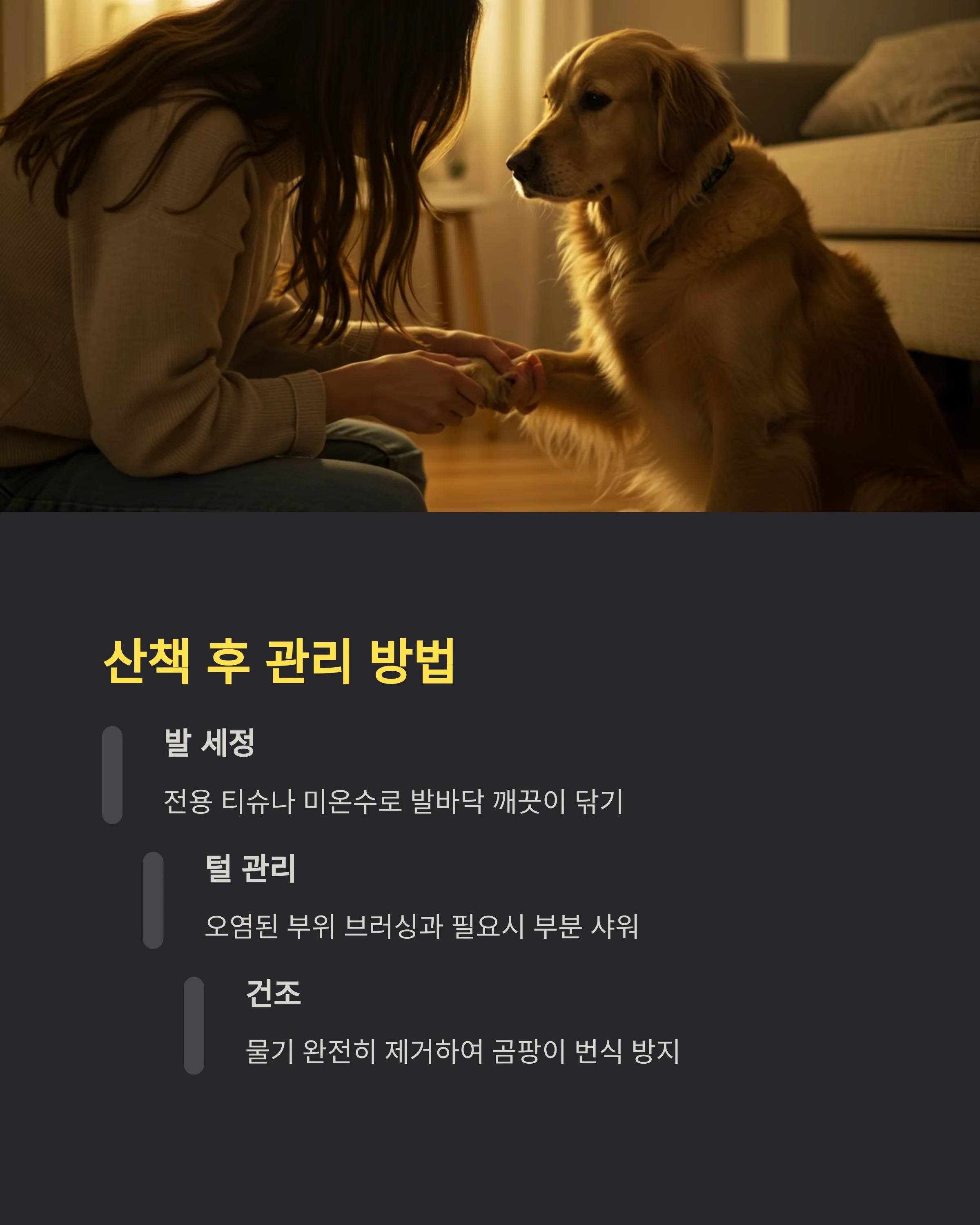 산책이나 외출 후에는 꼭 발과 배, 꼬리 등을 깨끗이 닦아주는 습관이 중요해요. 특히 여름철 물웅덩이나 낯선 동물의 배설물과의 접촉은 최대한 피해야 해요. 외출 후엔 전용 티슈나 발 세정제를 사용하는 것도 좋은 방법이에요.