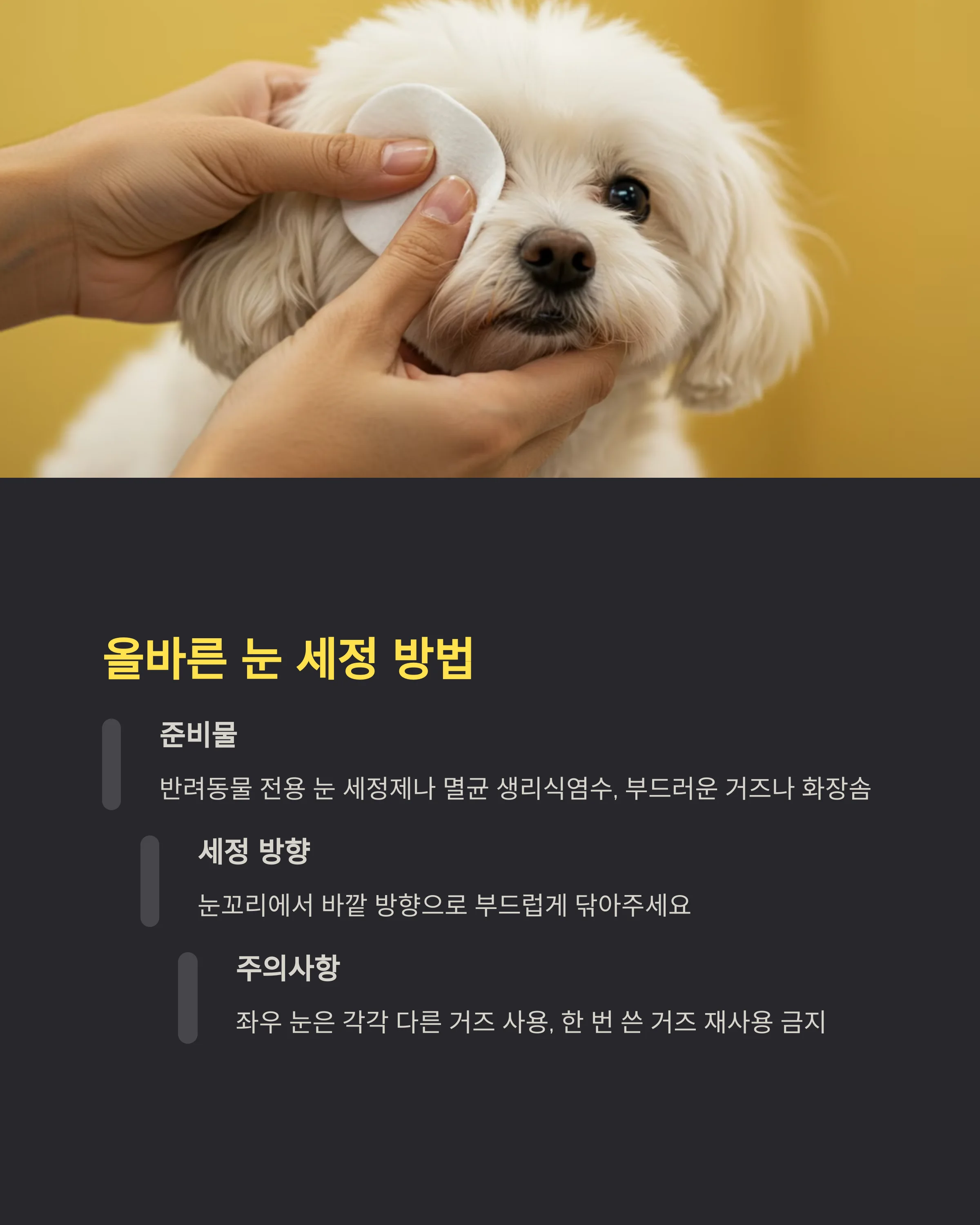 눈 주변을 닦을 때는 반려동물 전용 눈 세정제나 멸균 생리식염수를 사용해야 해요. 면봉보다는 부드러운 거즈나 화장솜을 사용하는 게 좋고, 한 번 쓴 거즈는 다시 사용하지 않도록 주의해요.