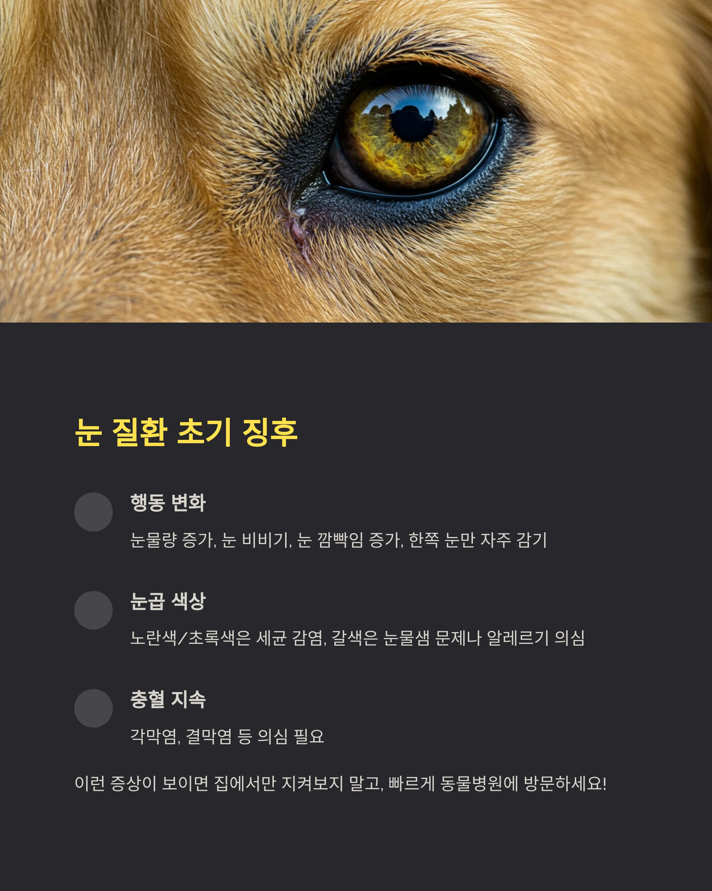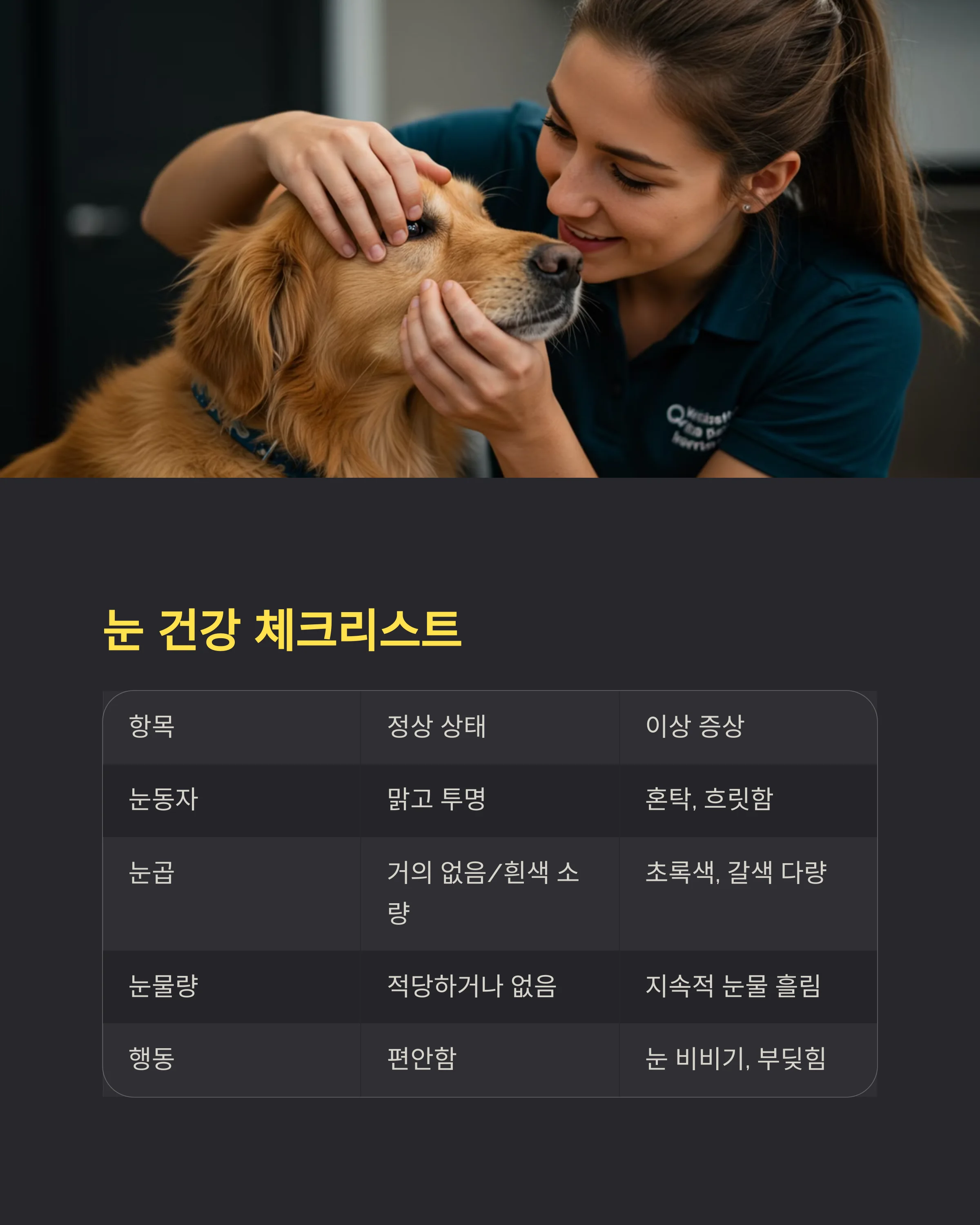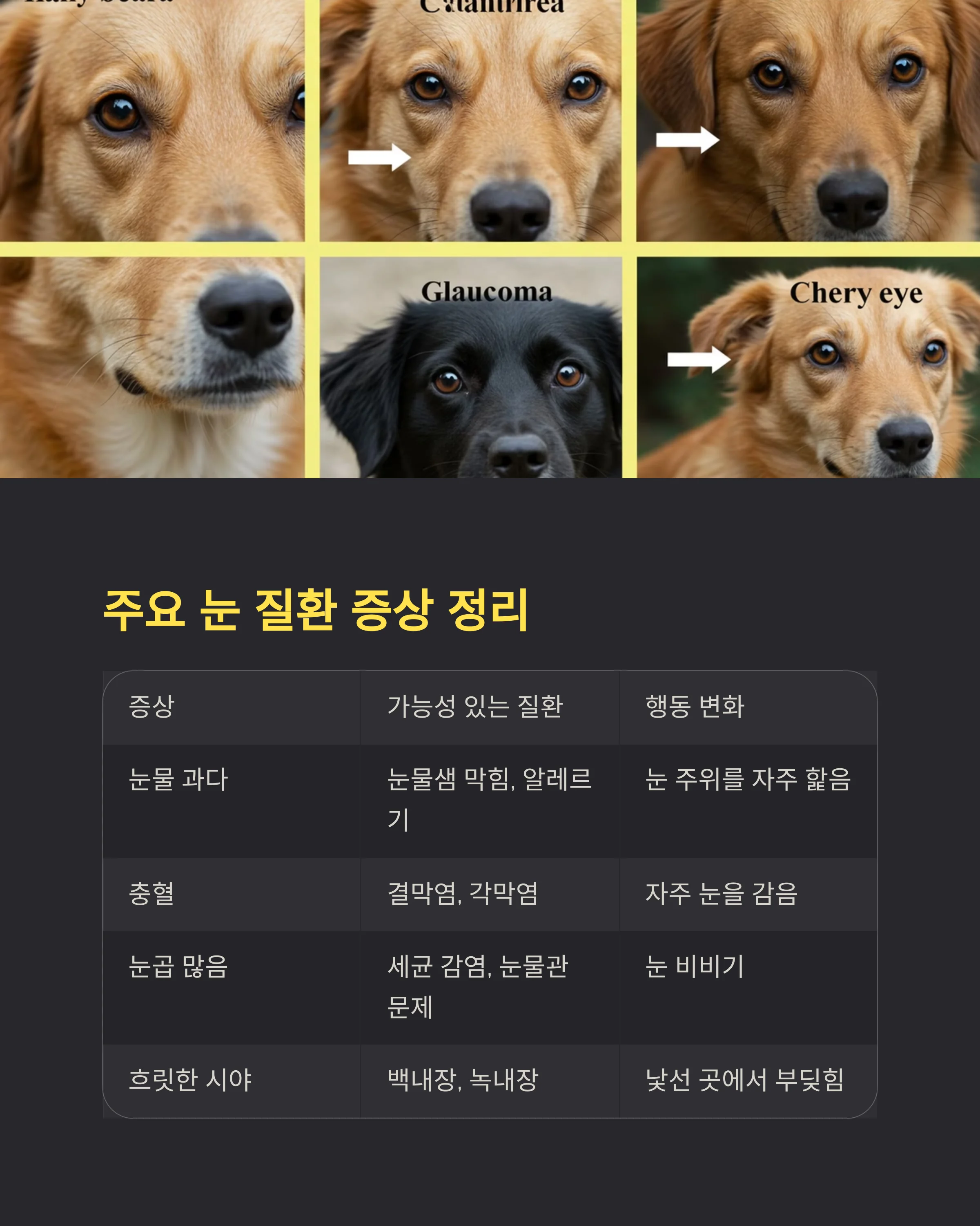 이제부터는 각종 눈 질환의 징후와 원인을 자세히 볼 거예요. 보호자가 초기에 발견하고 대응할 수 있도록 다음 섹션으로 이어집니다! 👇