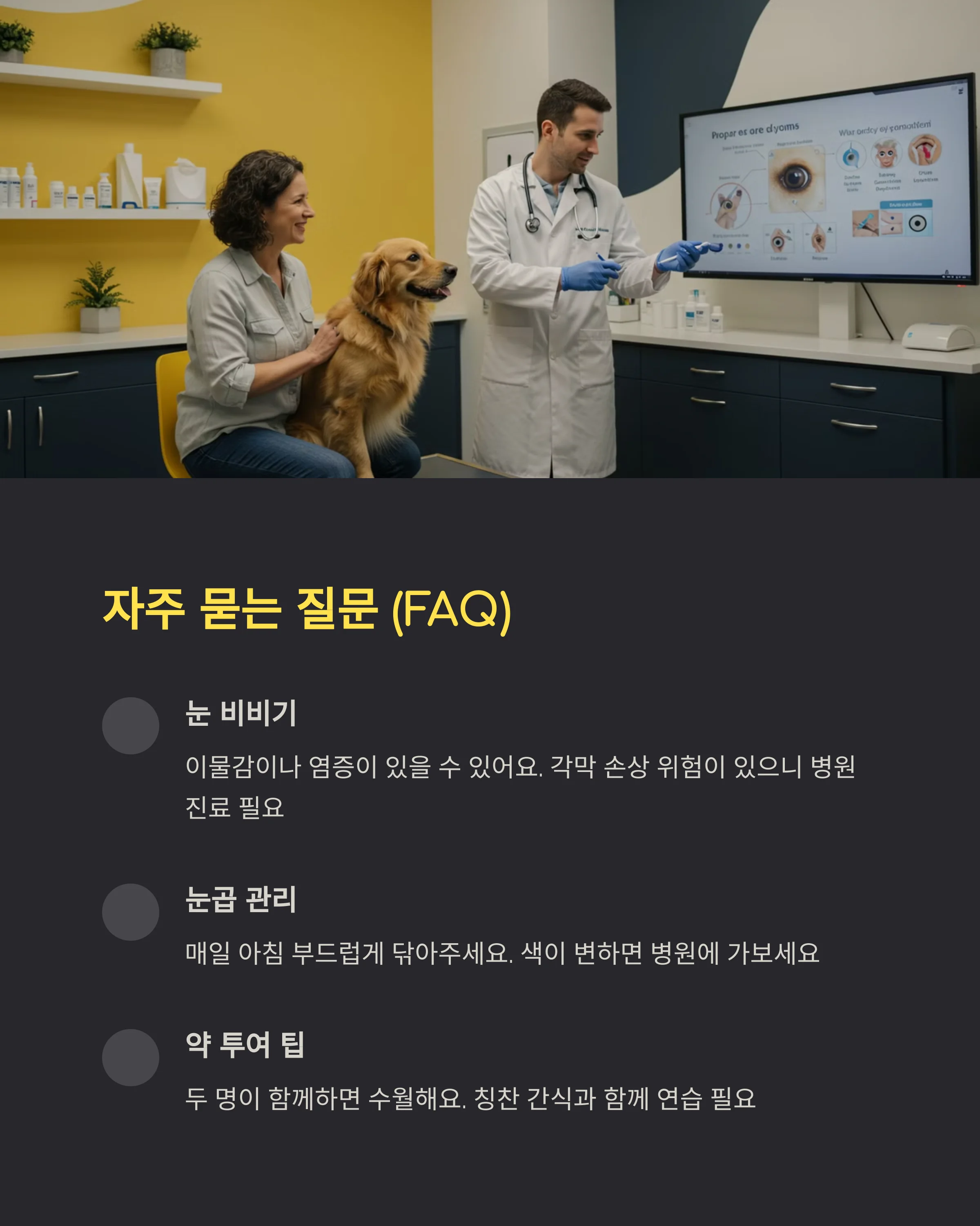 이런 증상이 보이면 절대 집에서만 지켜보지 말고, 동물병원에서 진료를 받아야 해요. 특히 눈은 하루만 지나도 급격히 악화될 수 있어서 빠른 대응이 중요하거든요.